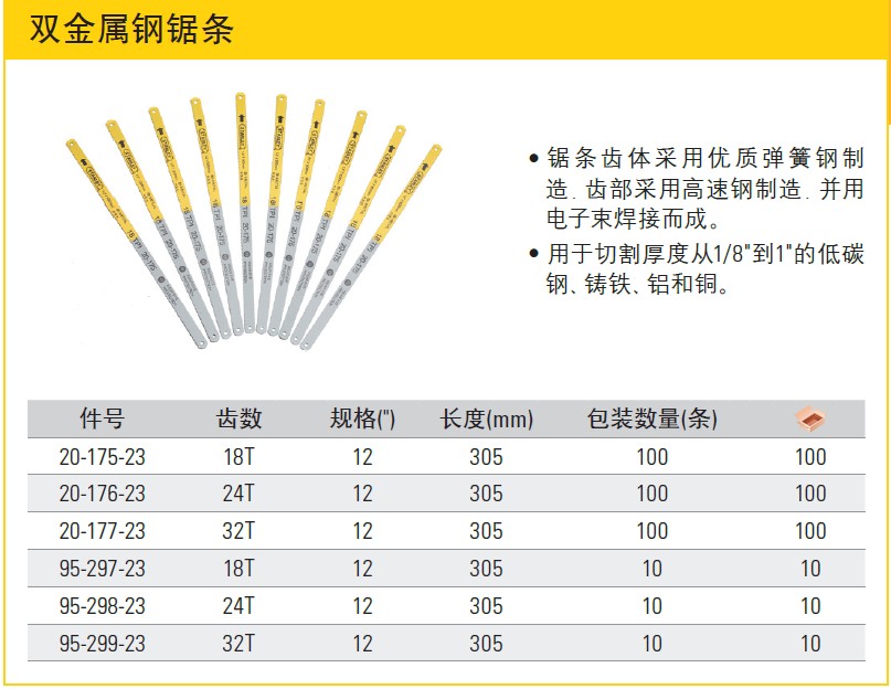 史丹利双金属钢锯条18/24/32齿20-175/176/177-23 95-297/298/299