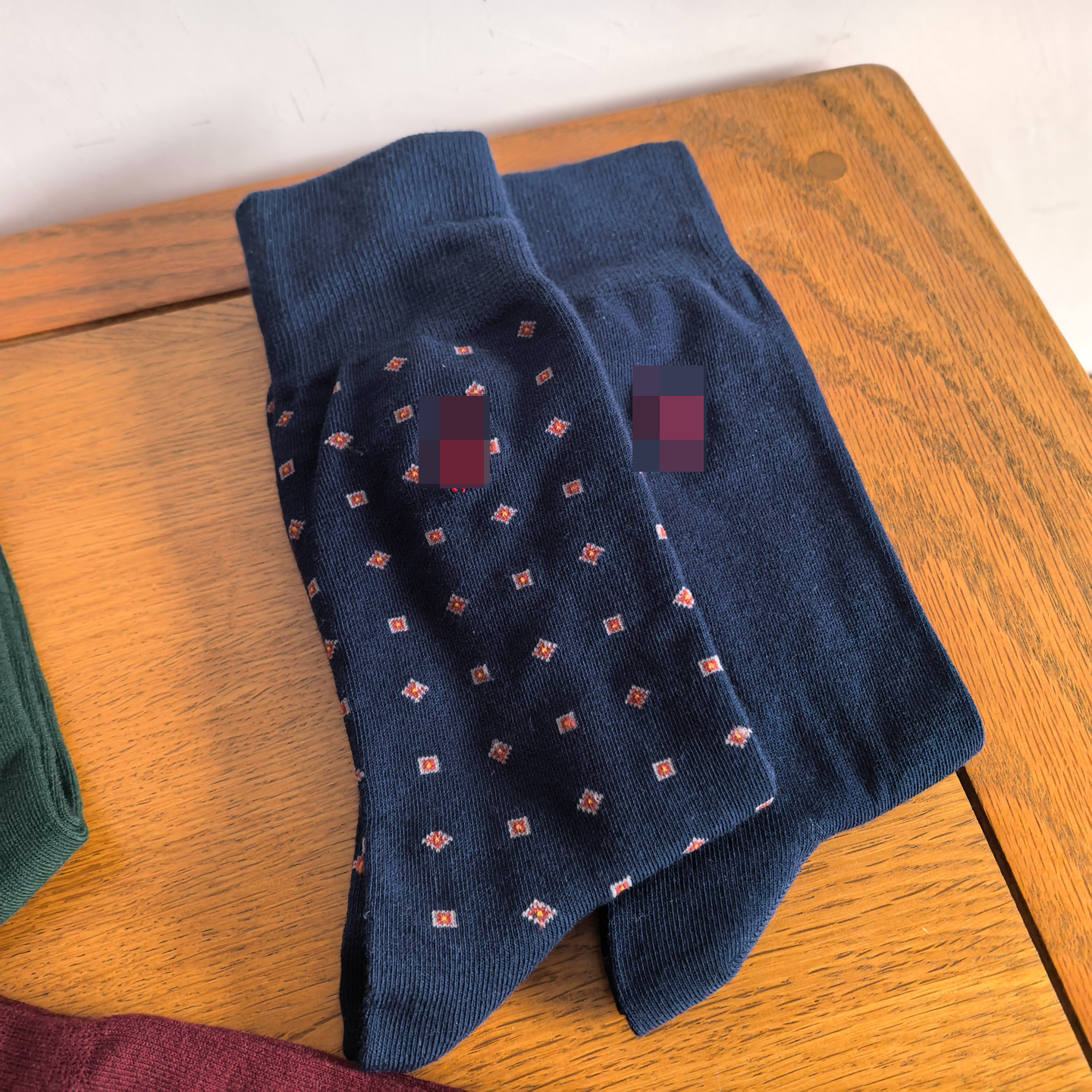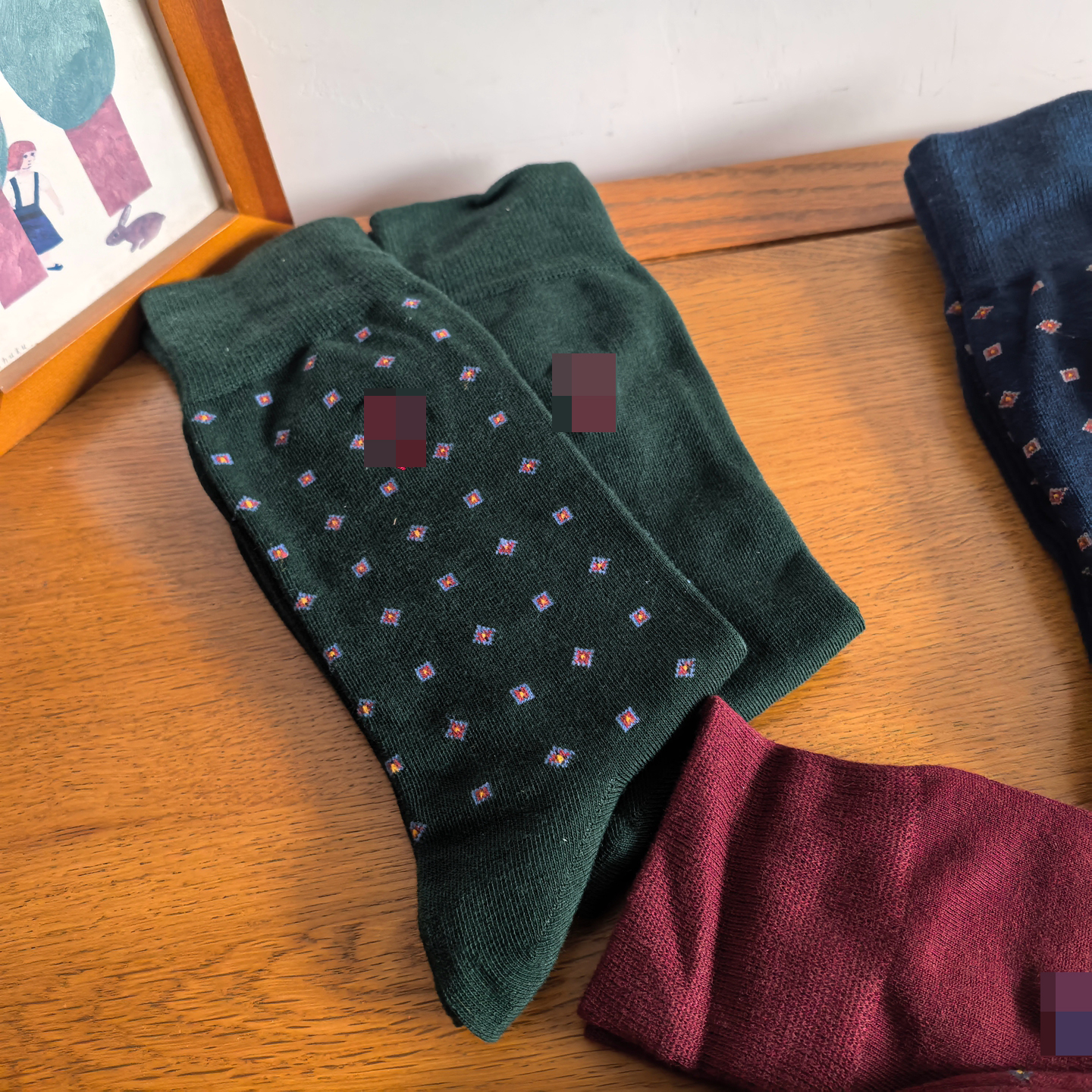 2双装男士袜子纯棉无骨缝头刺绣中筒袜绿色酒红色四季款小点点