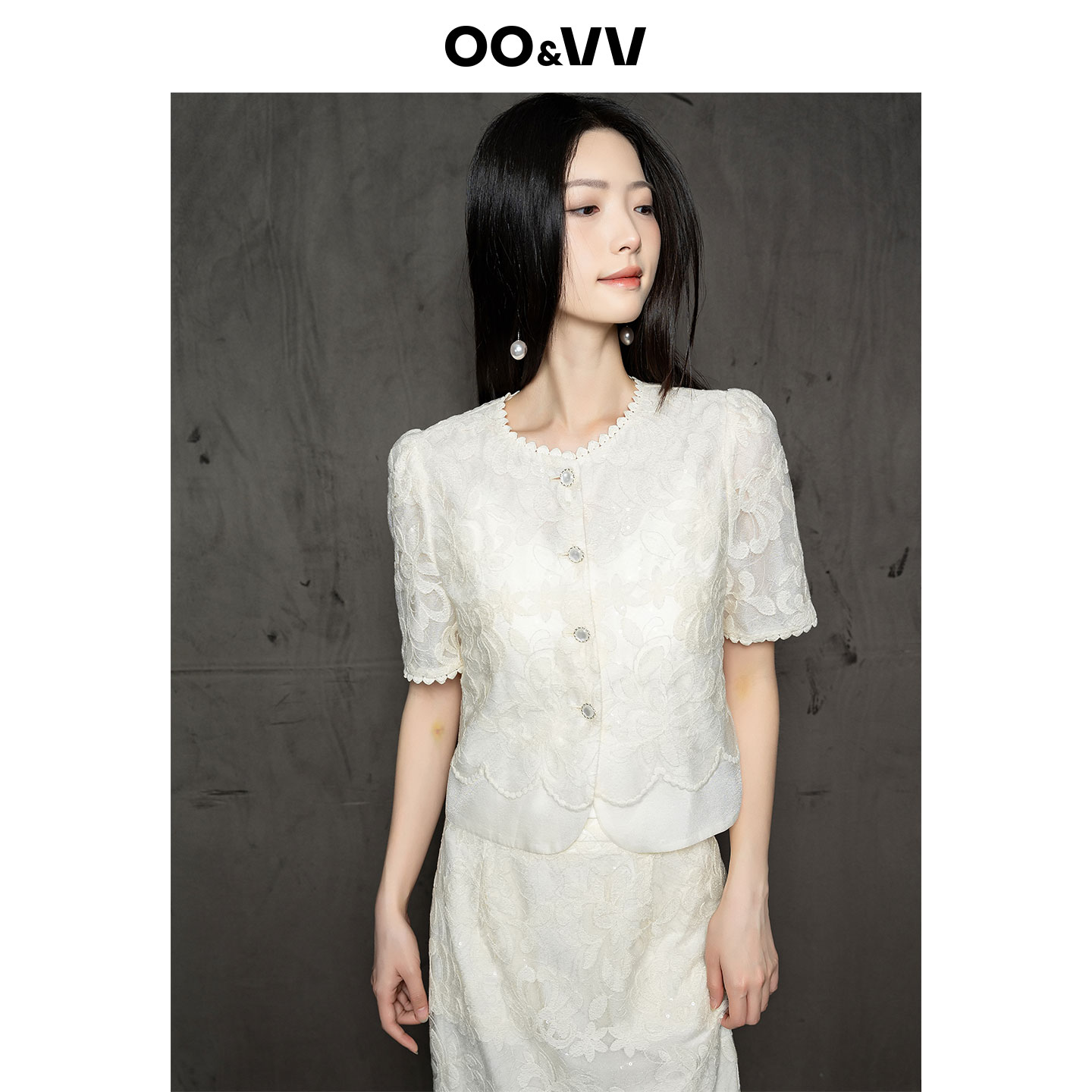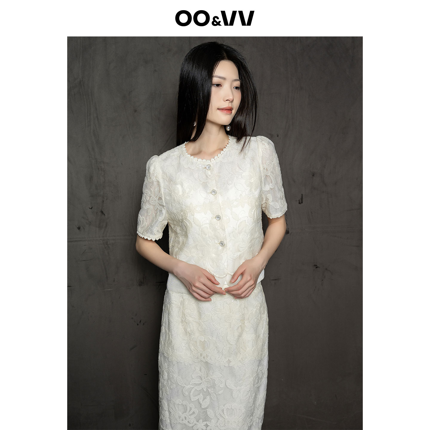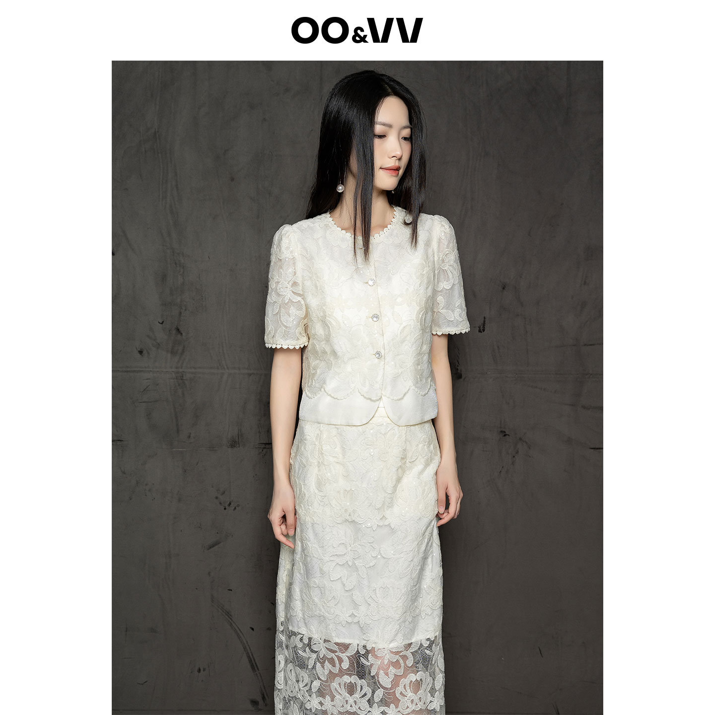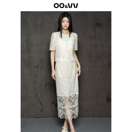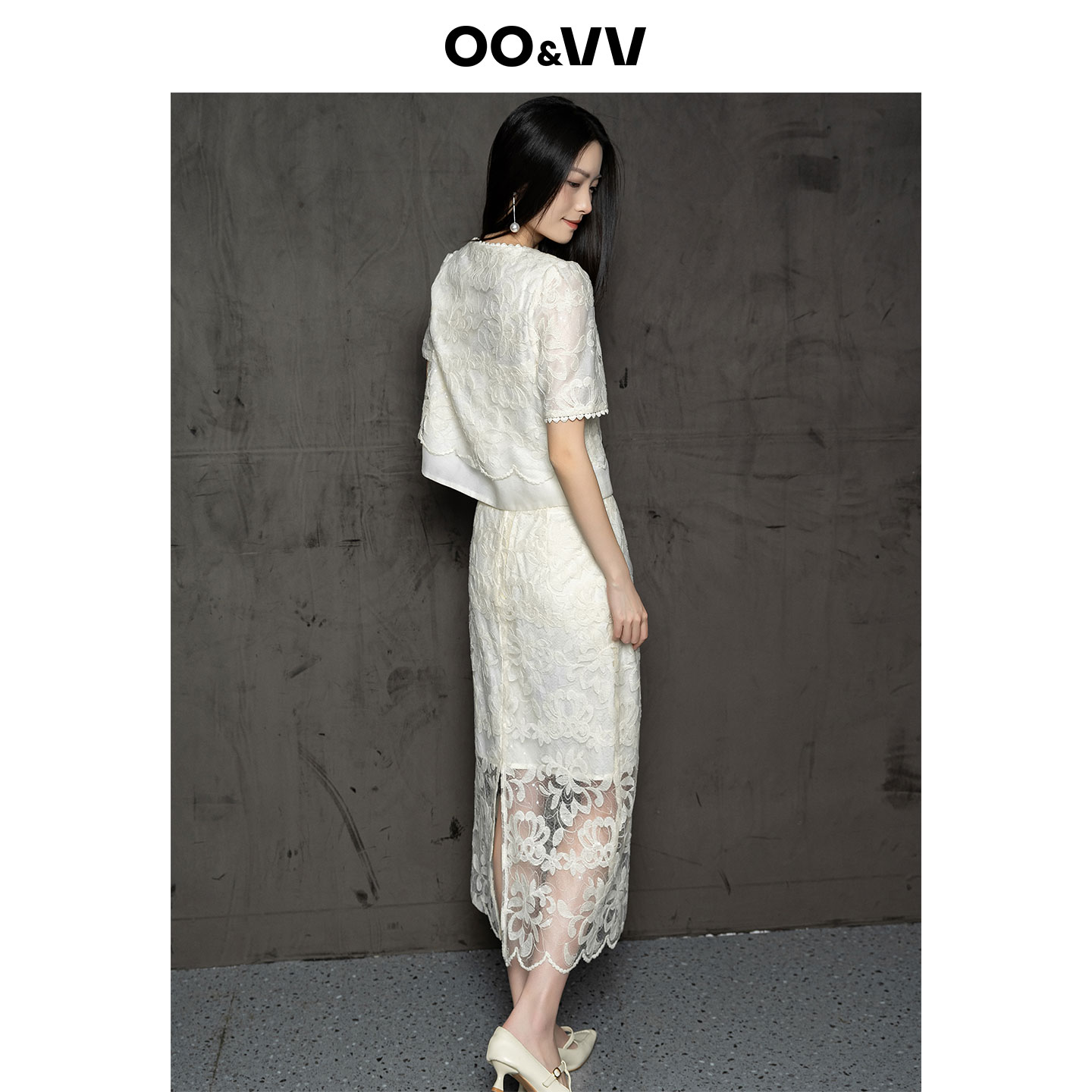 oo&vv小香风蕾丝透视2件套装裙女夏2025年双层气质圆领上衣半身裙