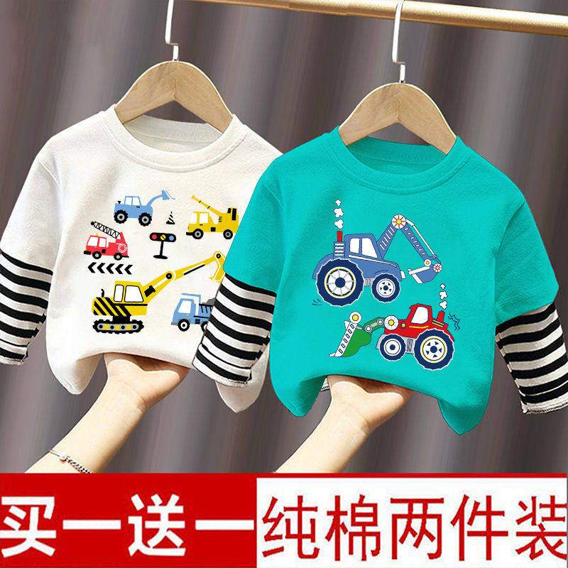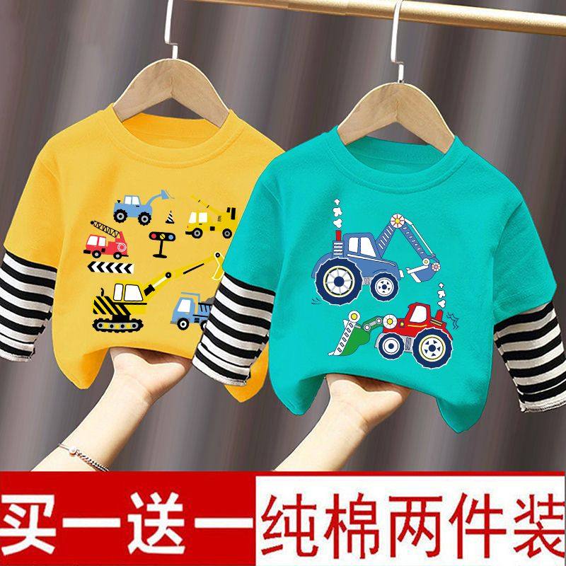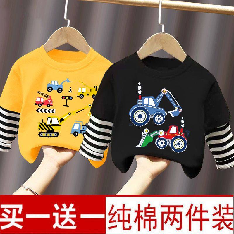 男童100%纯棉长袖T恤2025春秋新款男宝宝拼接假两件体恤休闲上衣