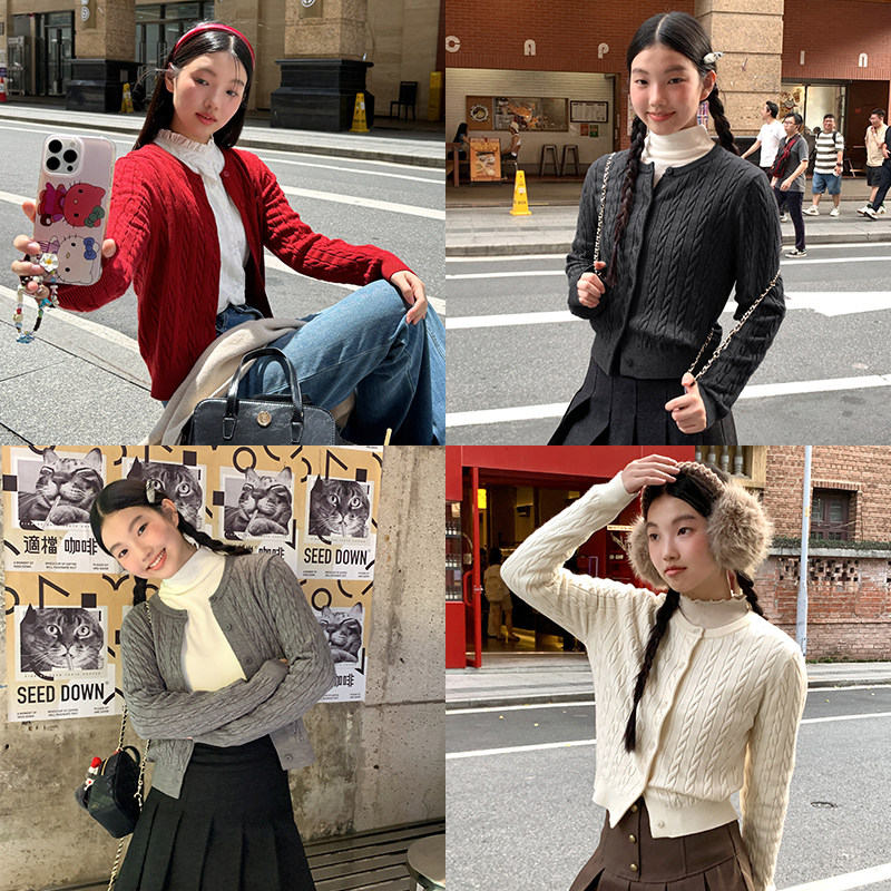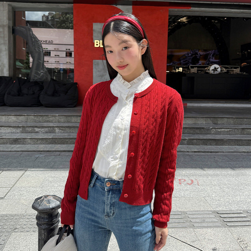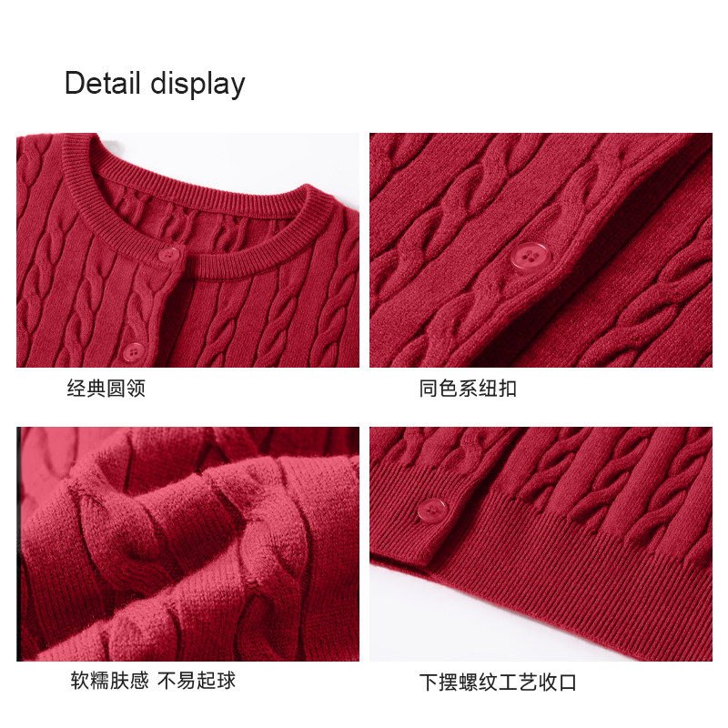 NOB真维斯红色纽花针织衫女2026新款秋季韩系慵懒风外搭开衫上衣
