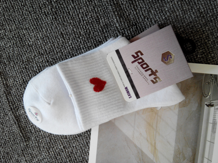 四季款女士纯棉袜子学院风小红心白色运动学生仿无骨无缝中筒袜