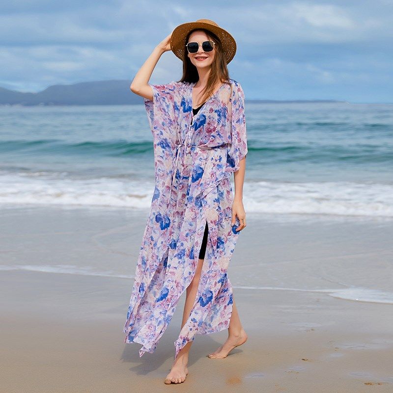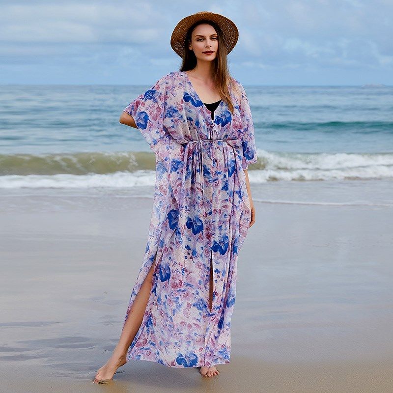 波西米亚海边度假大码沙滩裙两件套V领雪纺连衣裙开叉女士长裙