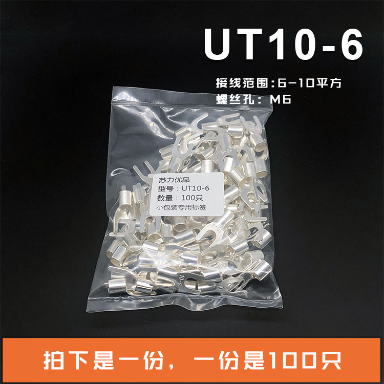 UT10-6 冷压接线端子U型Y形叉形裸端头铜线鼻子镀银接线耳 100只