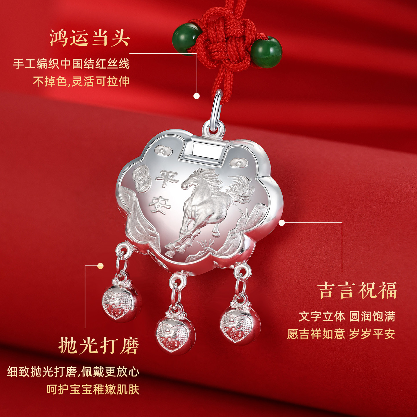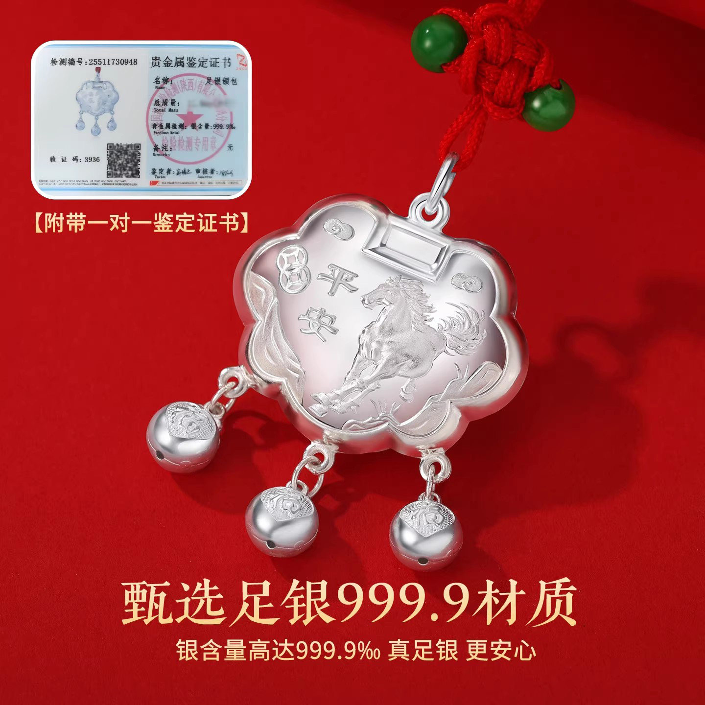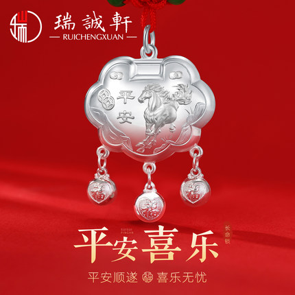 9999纯银吊坠足银马宝宝平安喜乐长命平安锁马年生肖本命年周岁礼