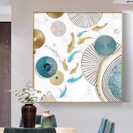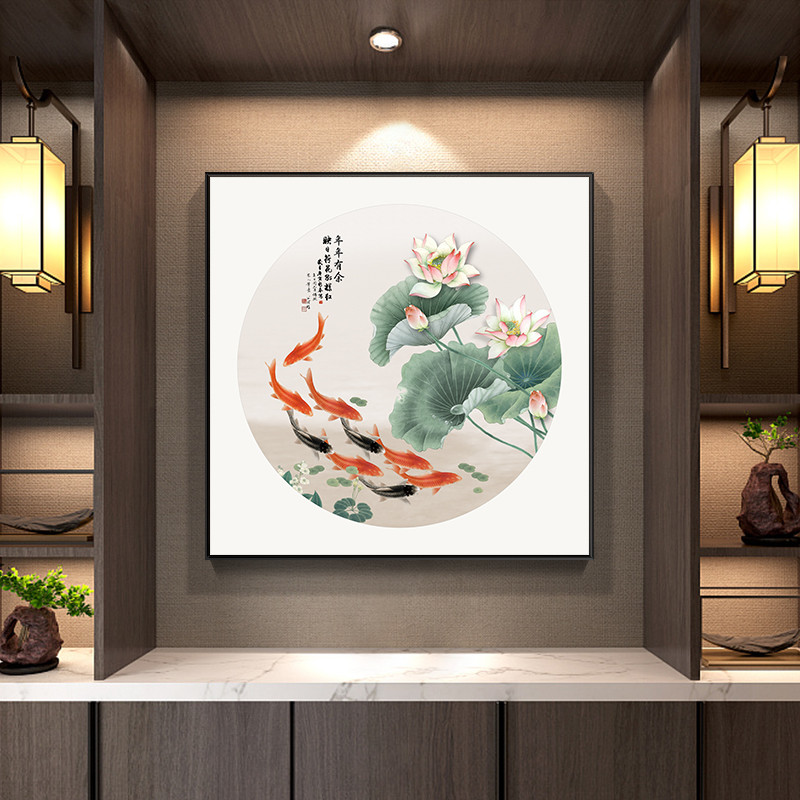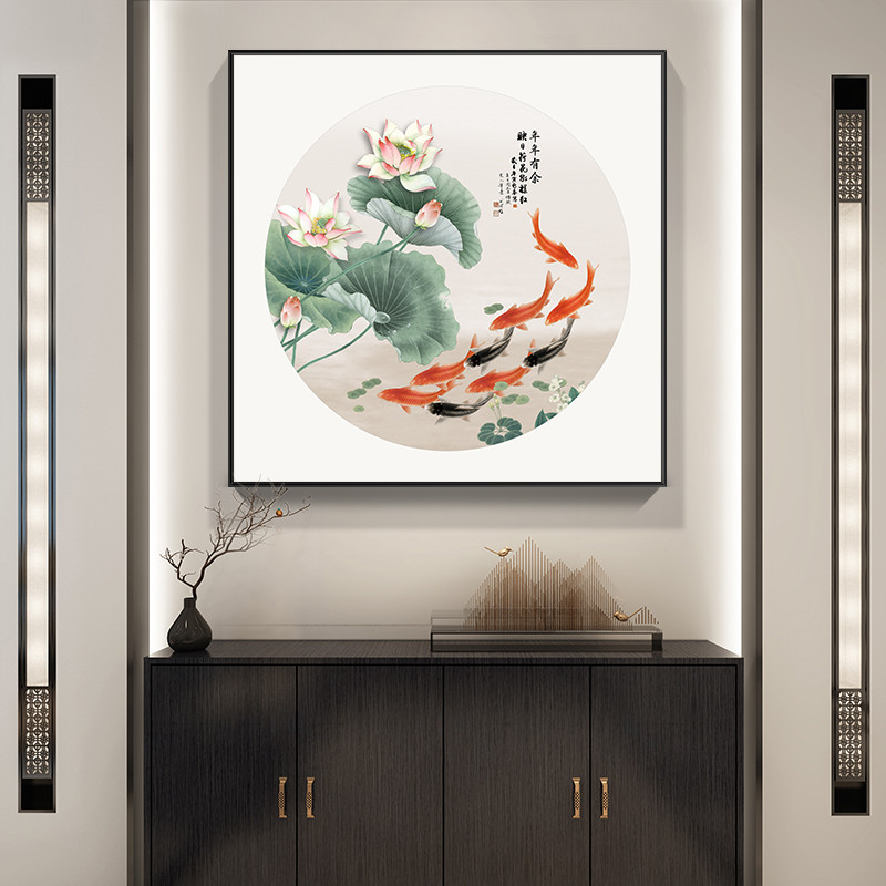 荷花九鱼图风水招财鲤新中式装饰画餐厅墙面装饰玄关挂画饭厅壁画