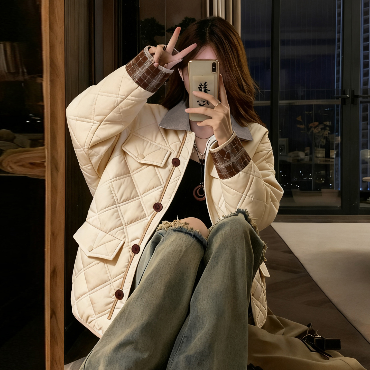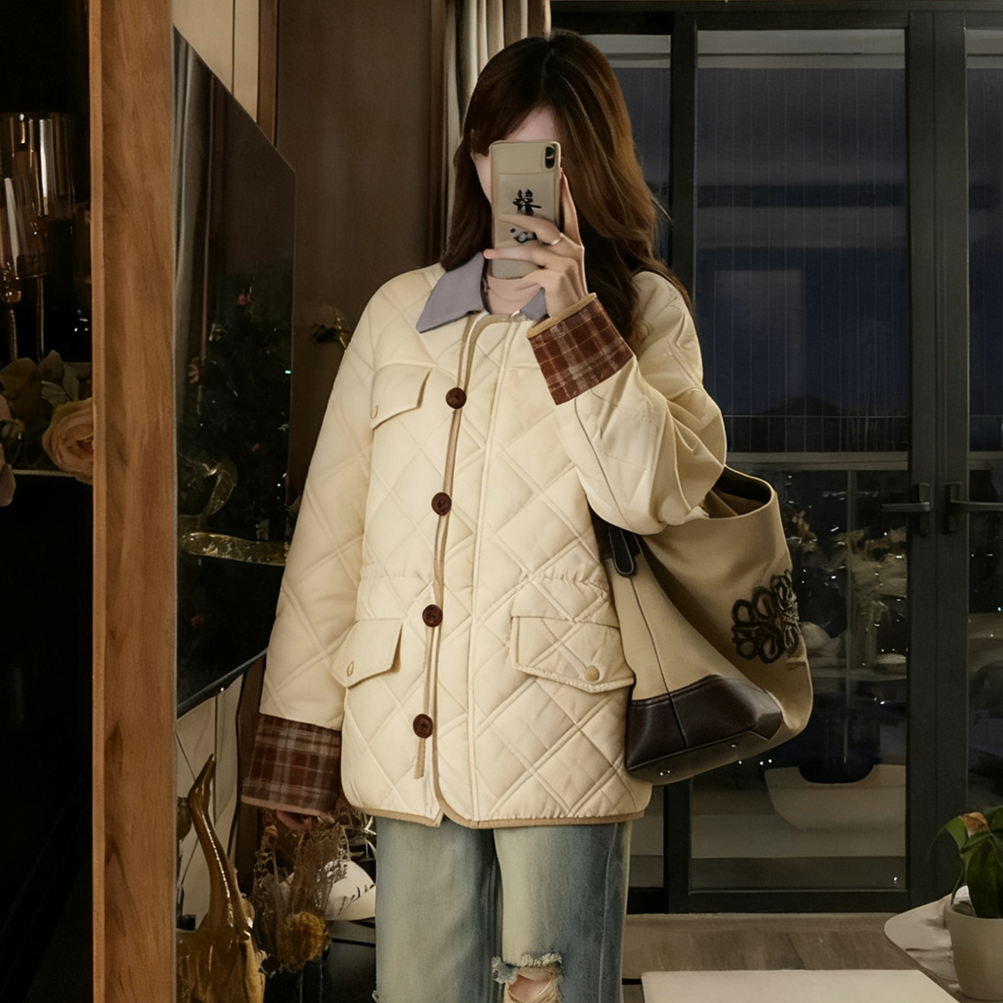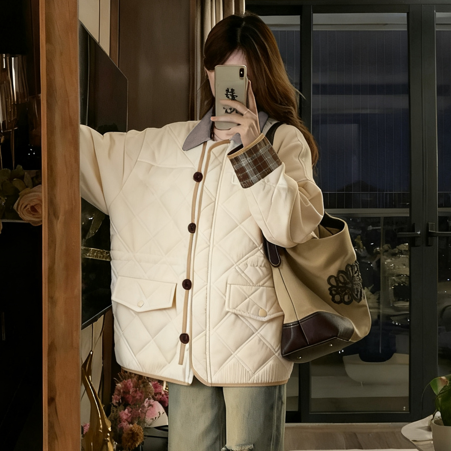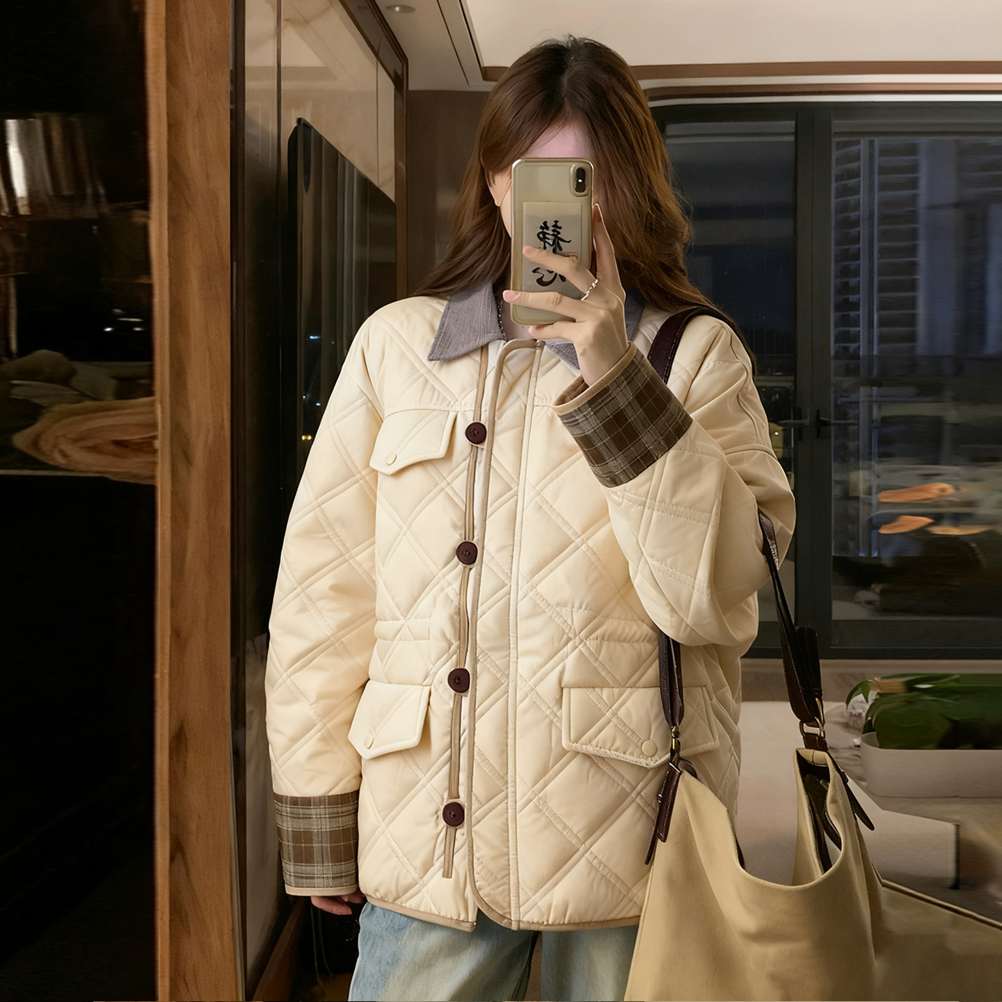 胖mm大码女装米白色慵懒风二棉外套女冬季加厚保暖单排扣棉服上衣