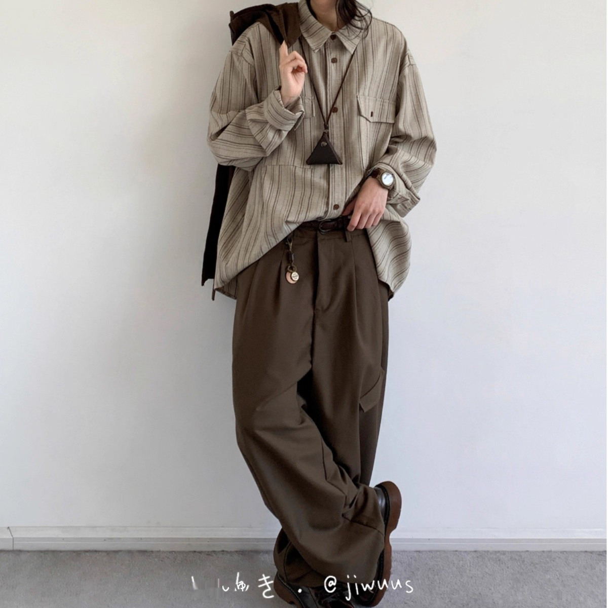 日系复古竖条纹长袖衬衫男女生春秋季方领宽松学院风长袖工装衬衣