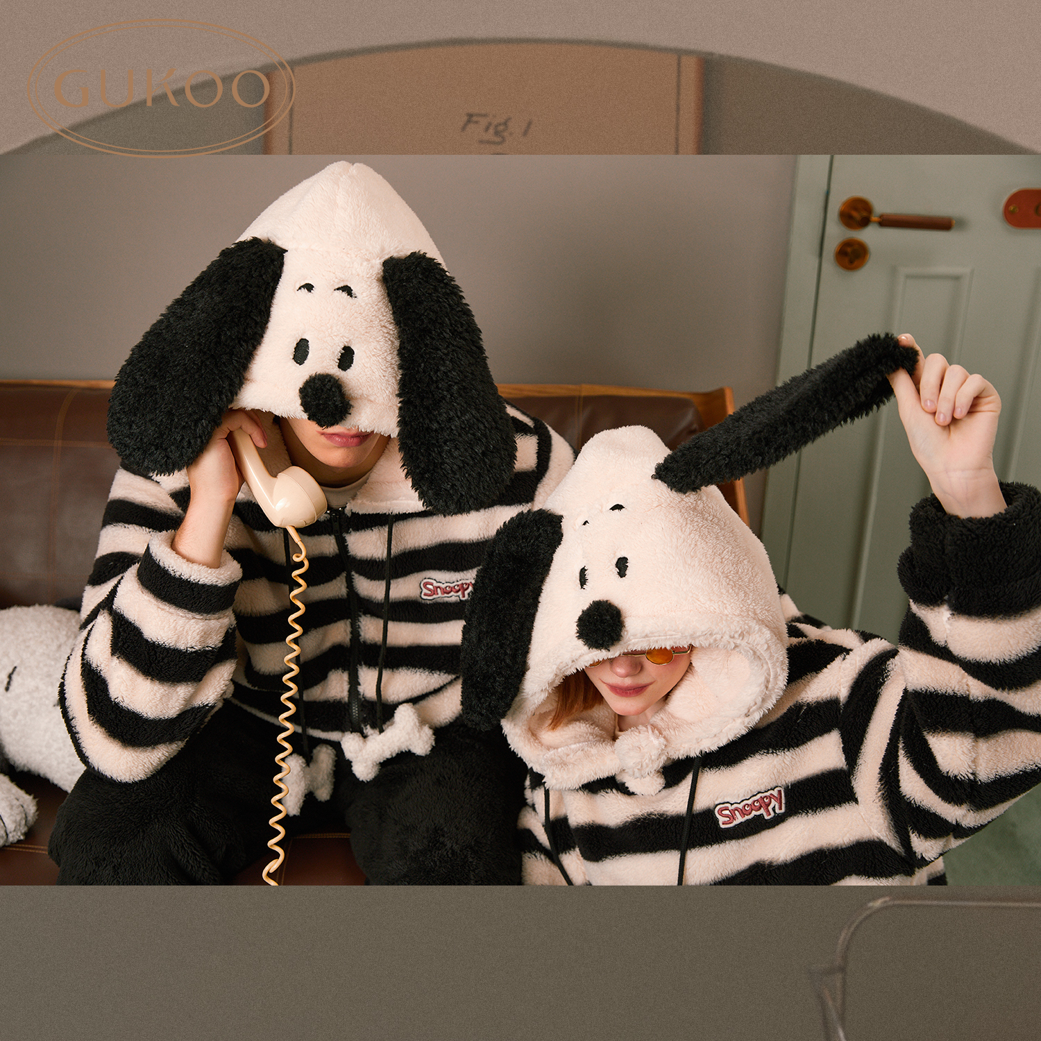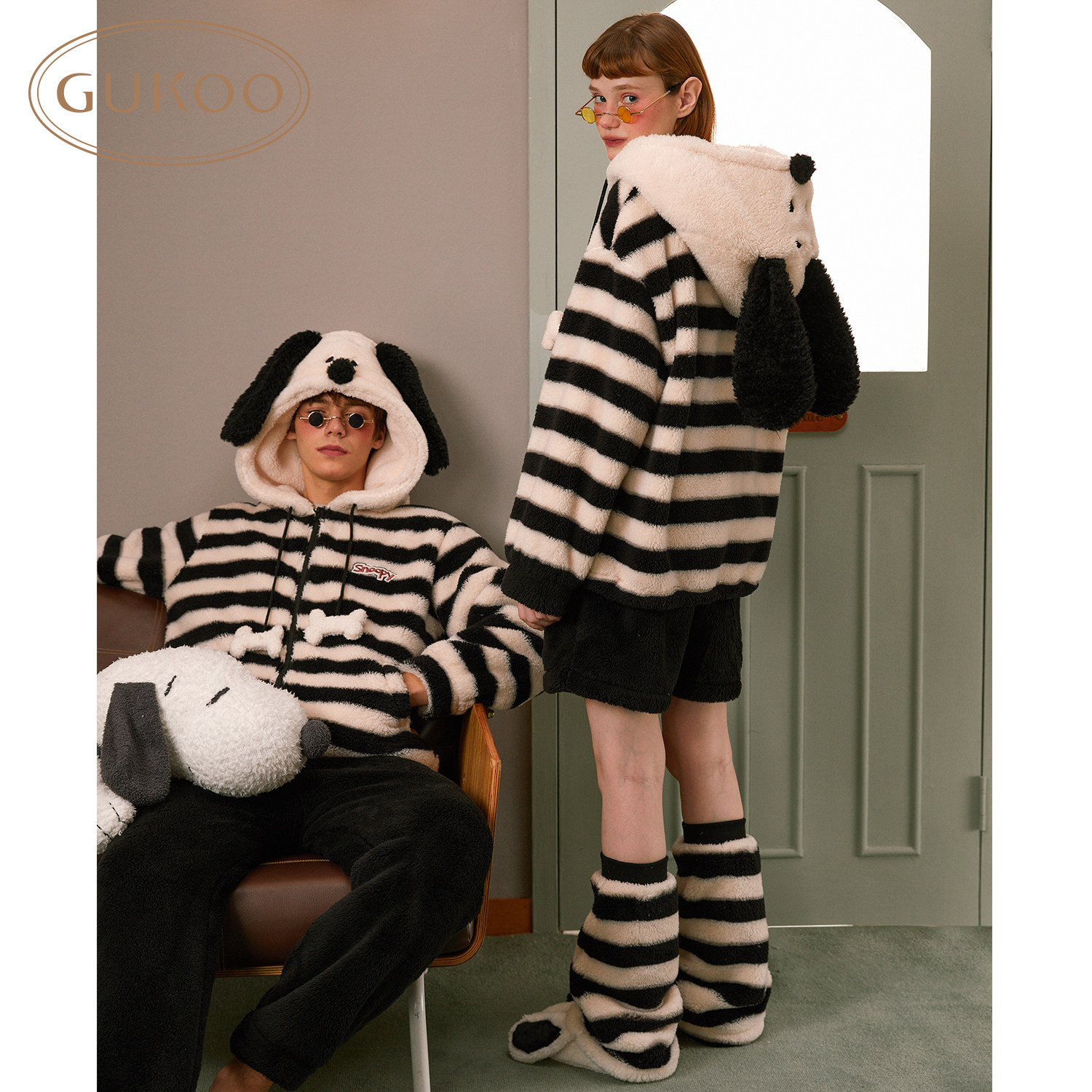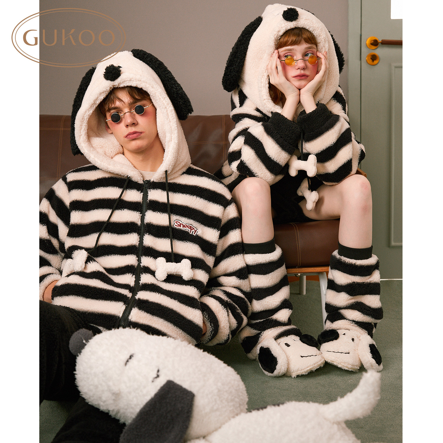 Gukoo/果壳睡衣情侣冬季史努比联名新款珊瑚绒保暖男家居服套装D