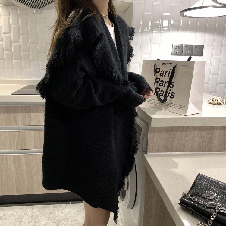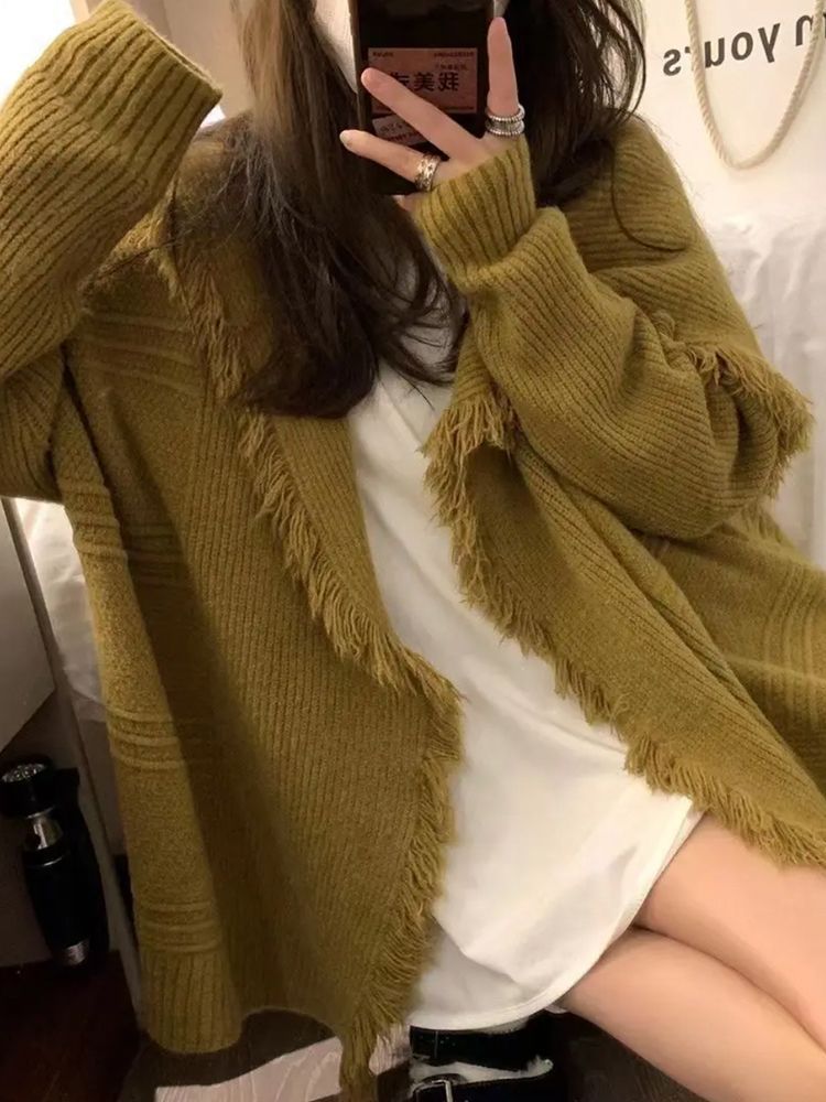 秋冬气质毛线开衫大翻领流苏针织衫中长款百搭毛衣女宽松显瘦外套
