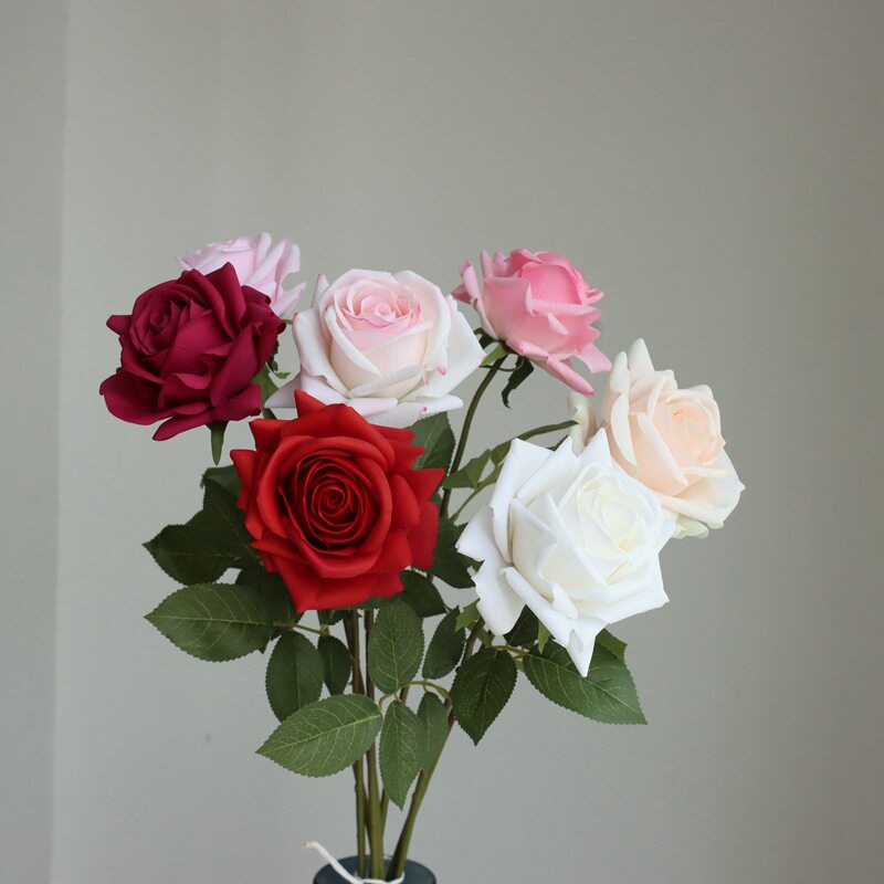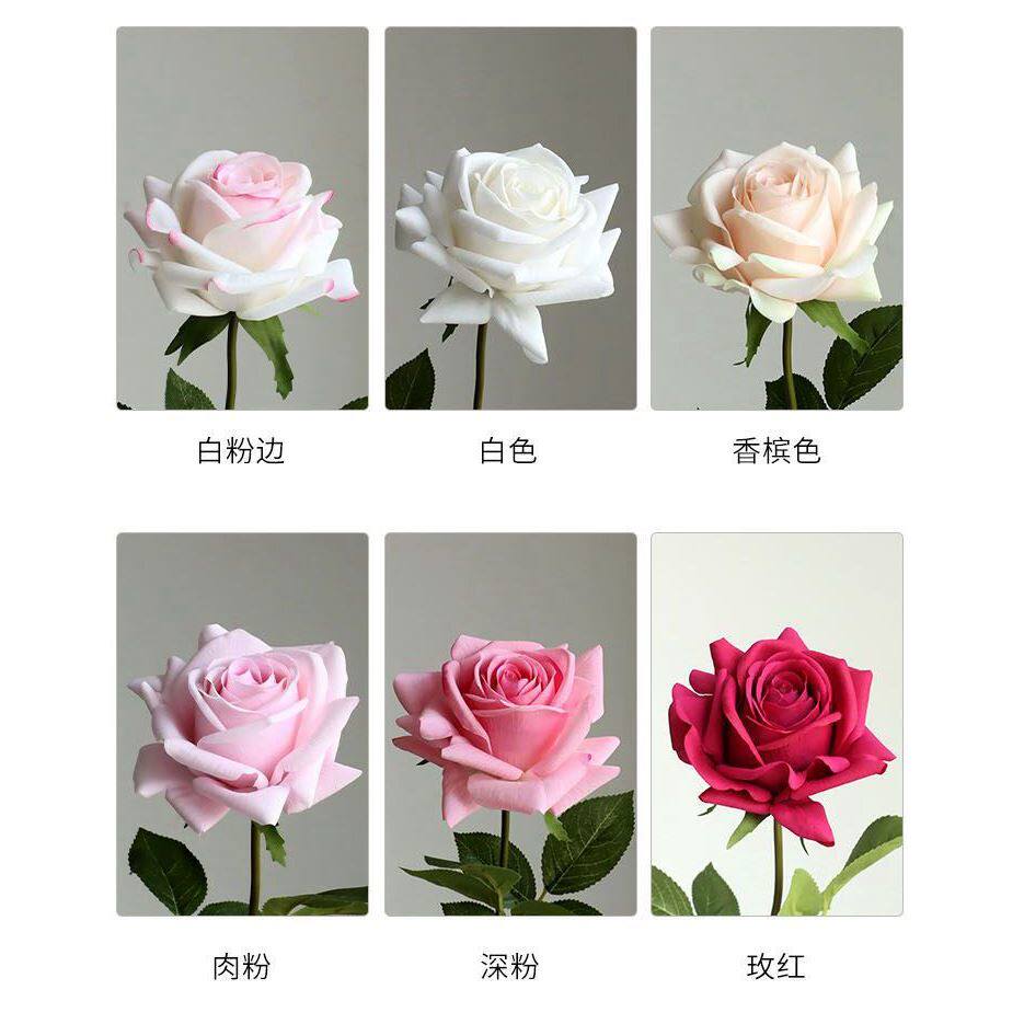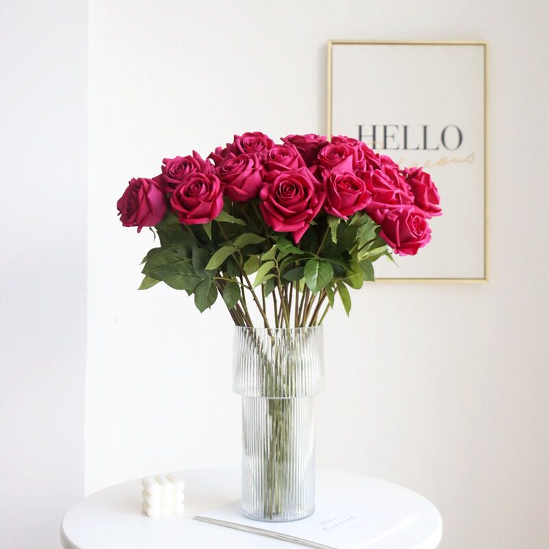 新品玫红色仿真假花湿感大卷边玫瑰花材婚礼婚庆新房装饰摆件