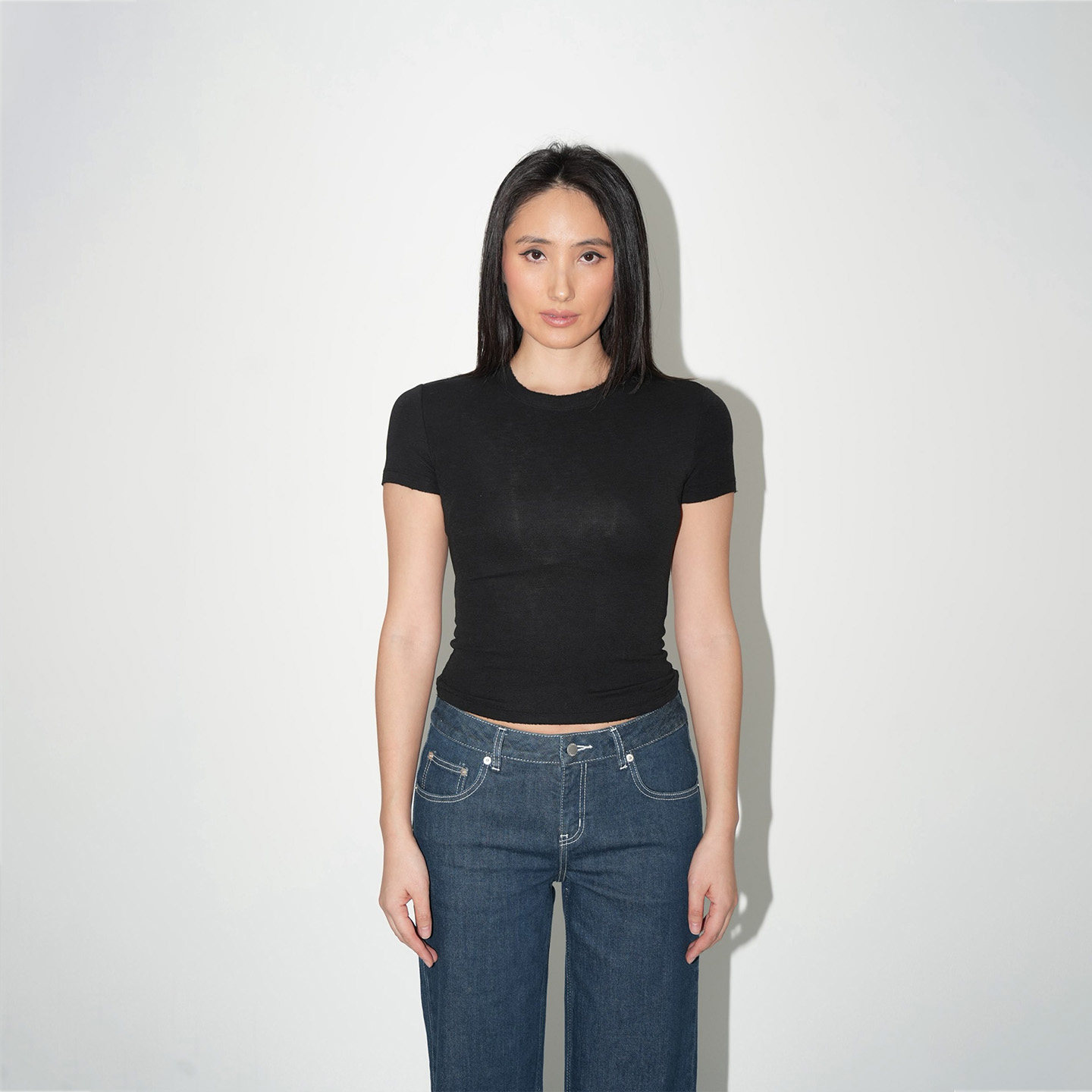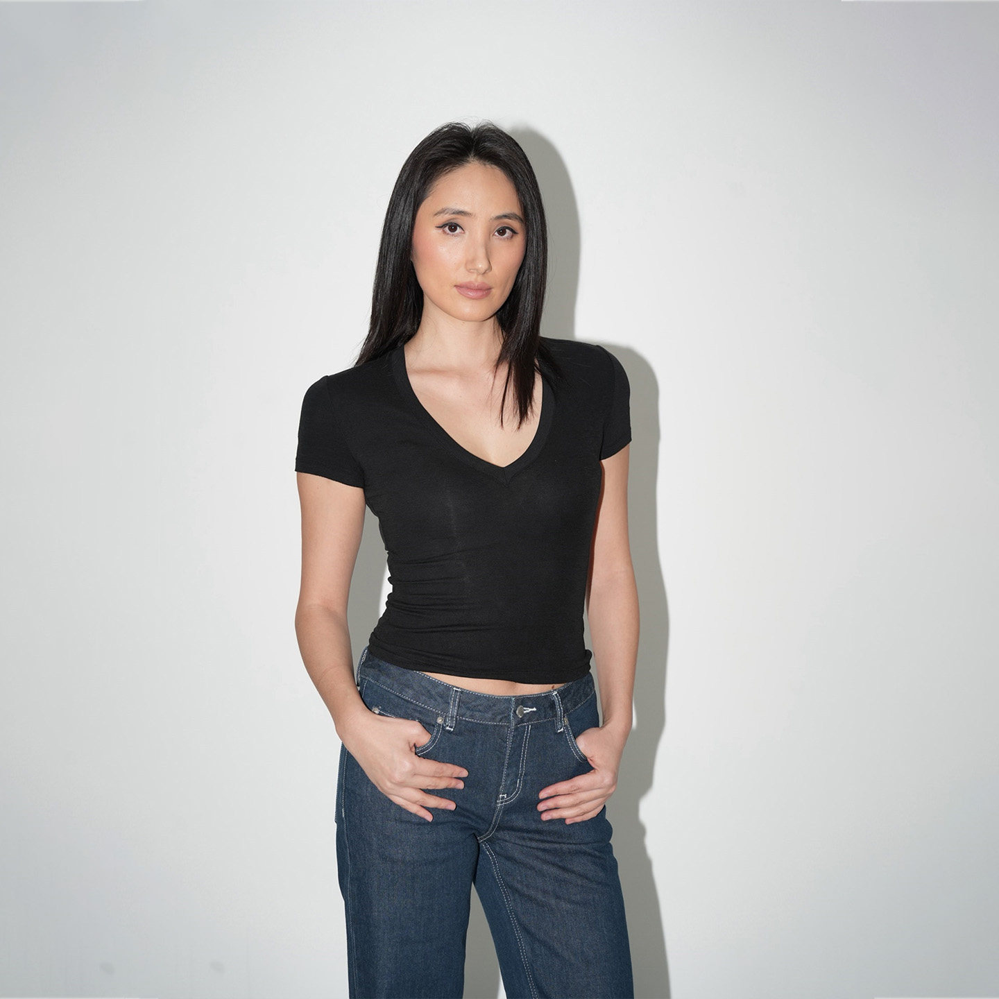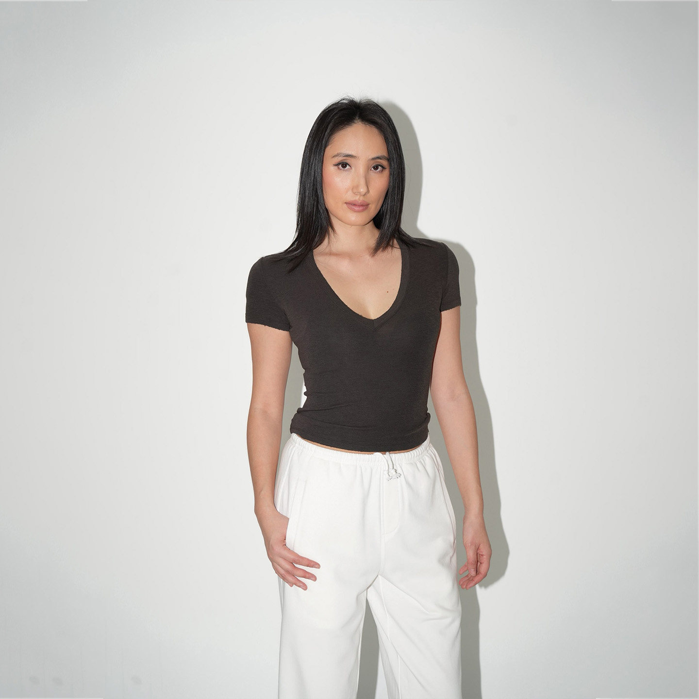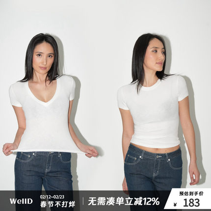 WellD 雪花棉V领圆领散边短袖T恤女春夏季基础百搭打底外穿上衣