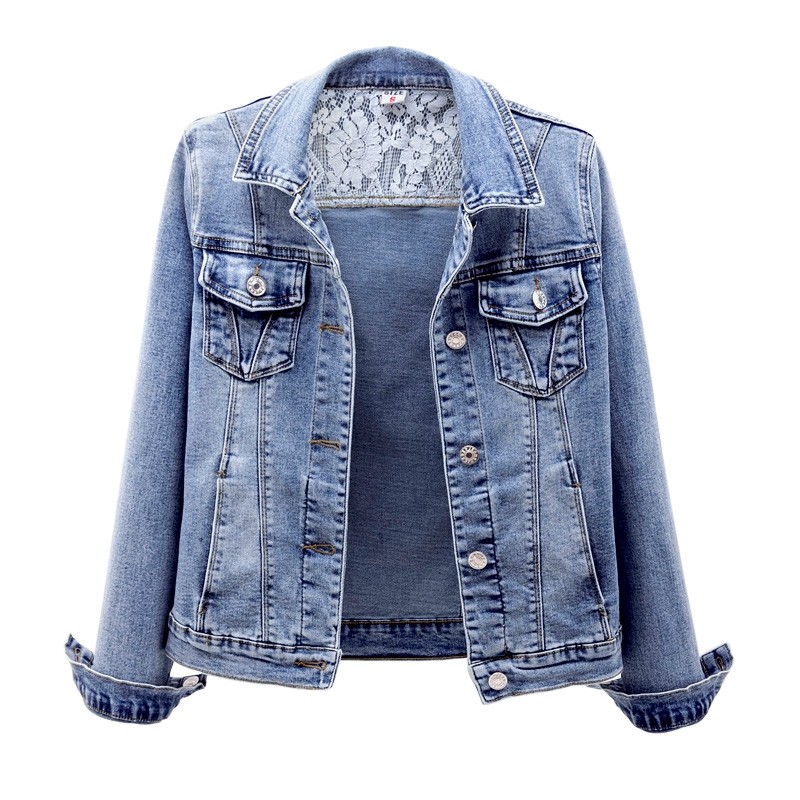 2024春秋新款弹力牛仔外套女短款蕾丝贴布百搭夹克修身学生上衣潮