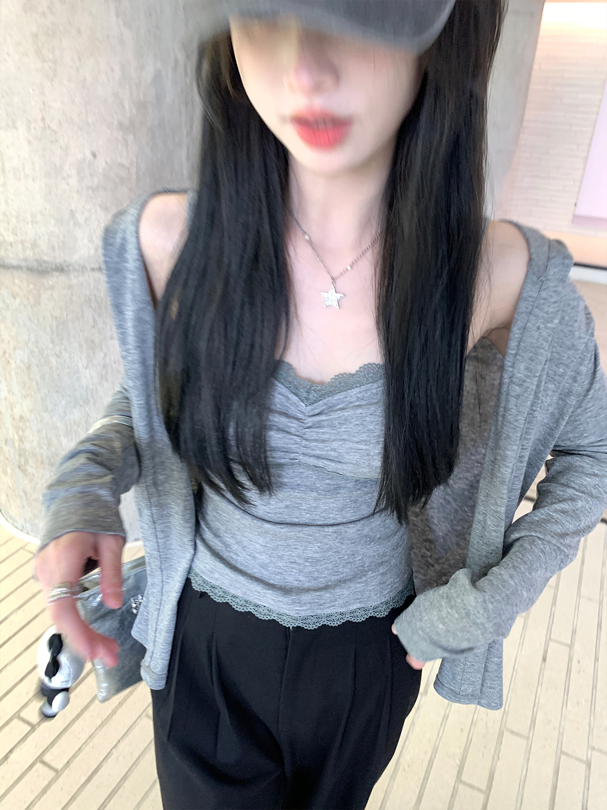 珍珍家显瘦天丝羊毛针织开衫蕾丝吊带打底半裙三件套纯欲温柔套装