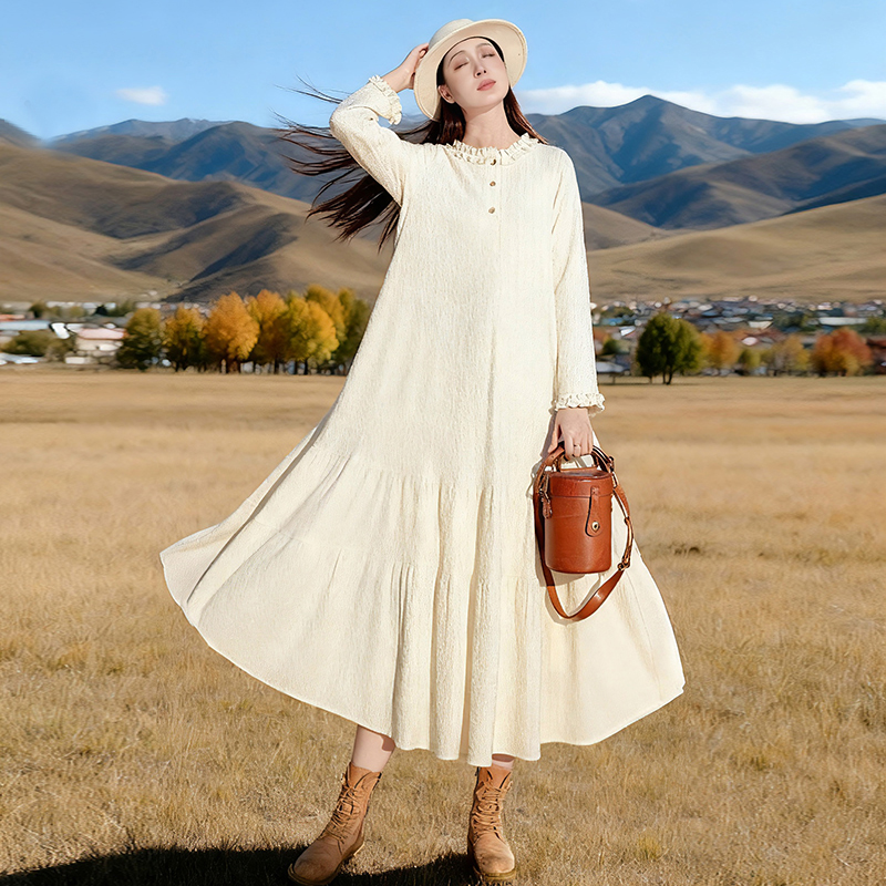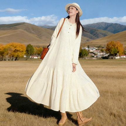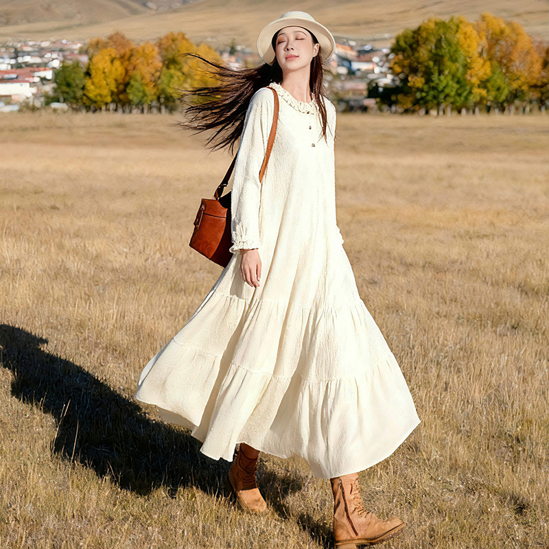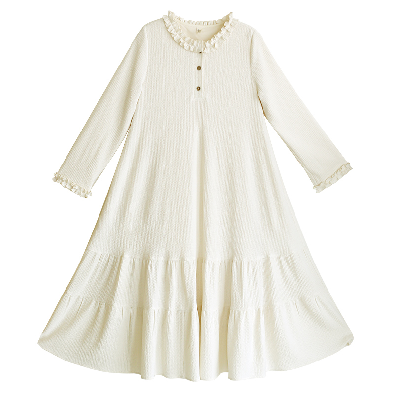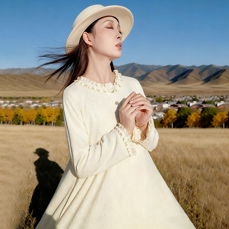 【甜蜜心事】文艺针织荷叶边连衣裙女2025年秋季宽松米色温柔裙子