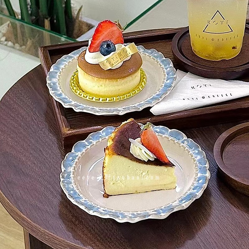 高颜值法式烟蓝花边甜品盘精致高级感陶瓷水果沙拉盘蛋糕盘甜点盘