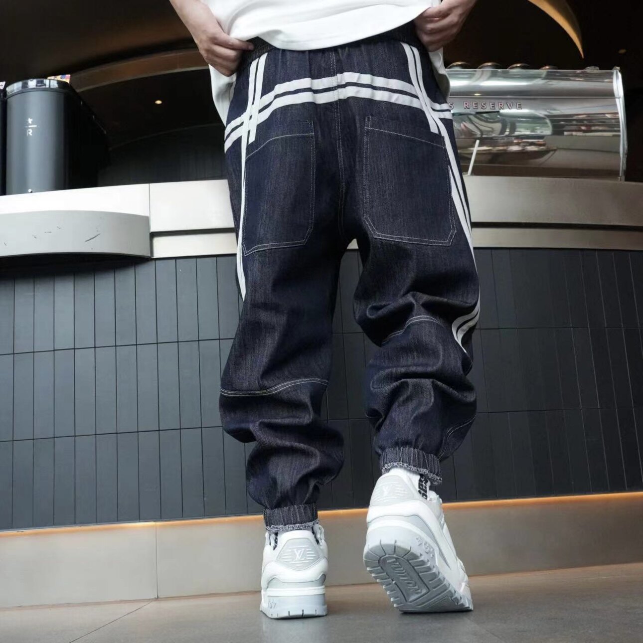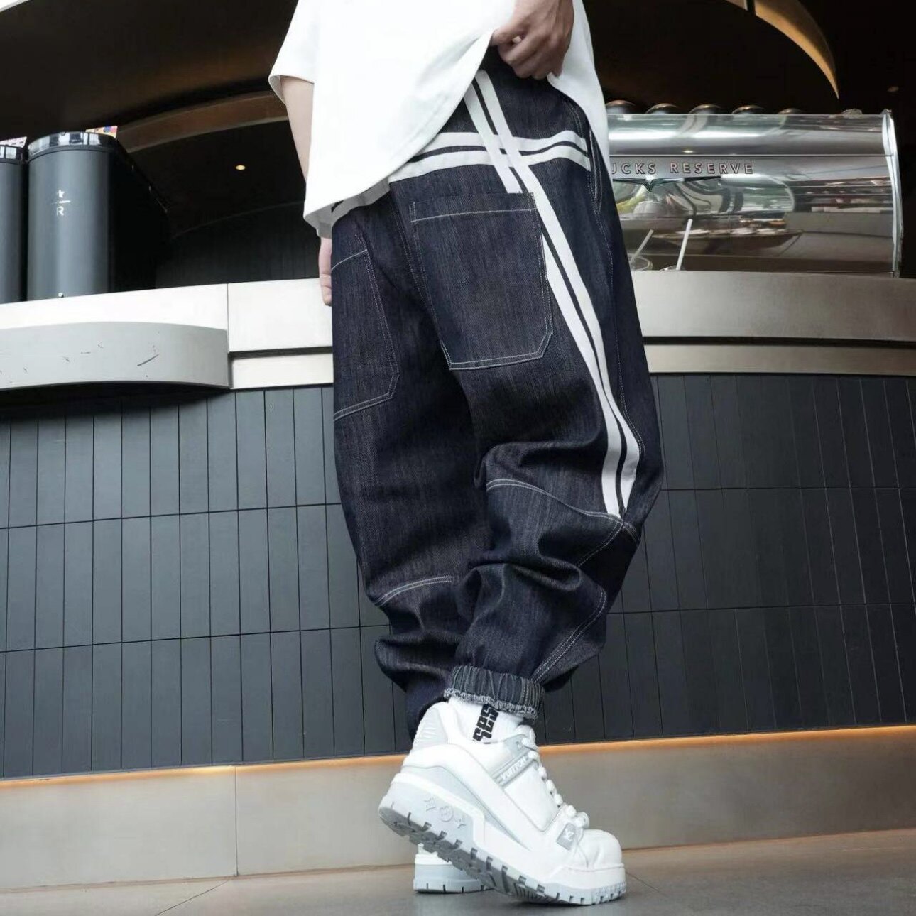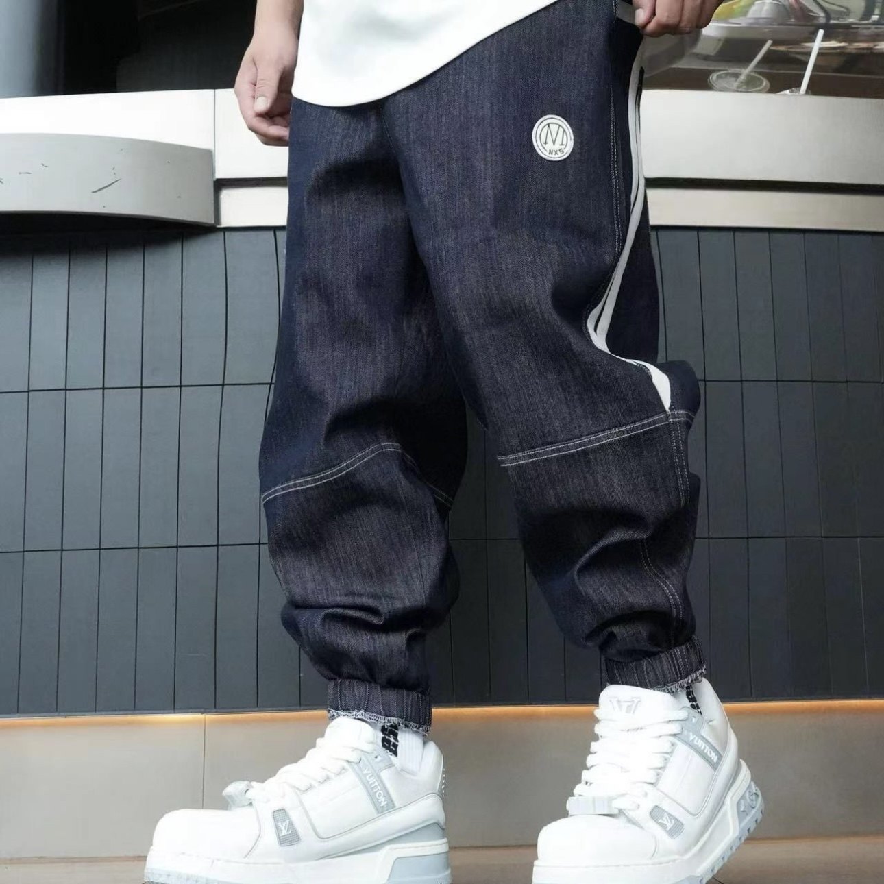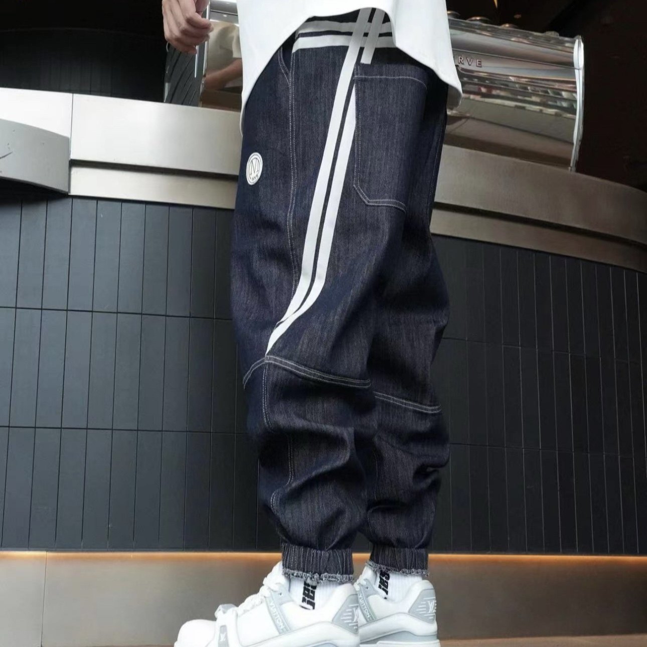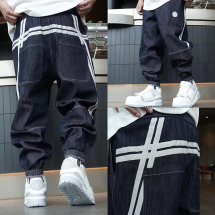 春季男士新款重工水洗织带拼接束脚牛仔裤时尚百搭宽松休闲哈伦裤