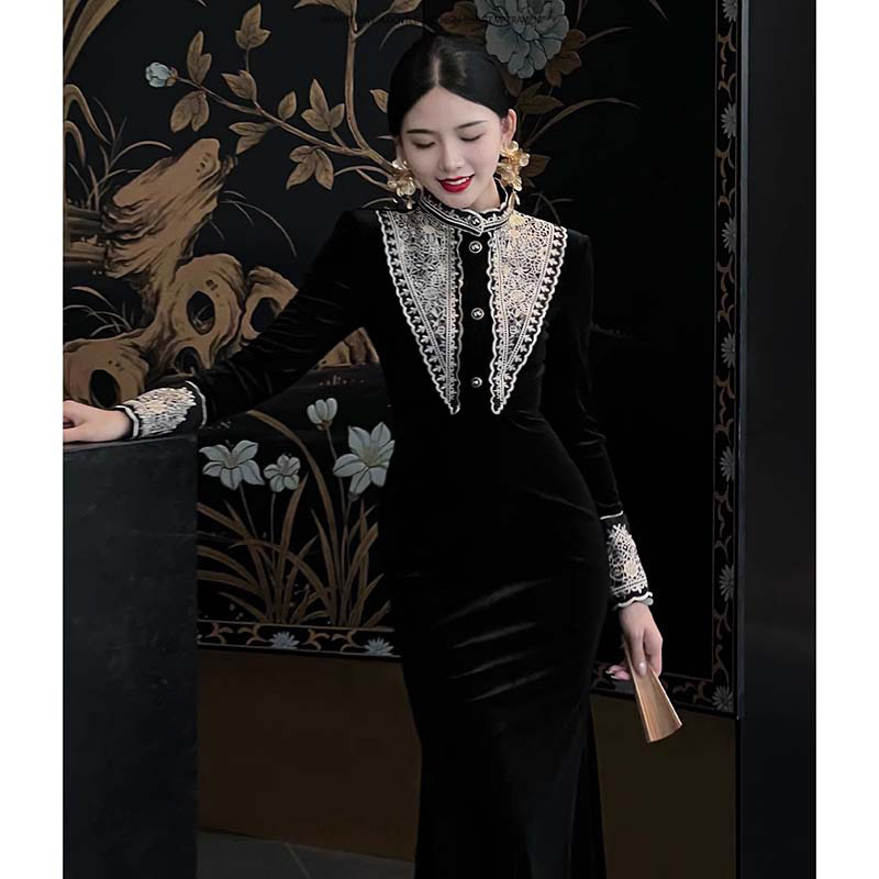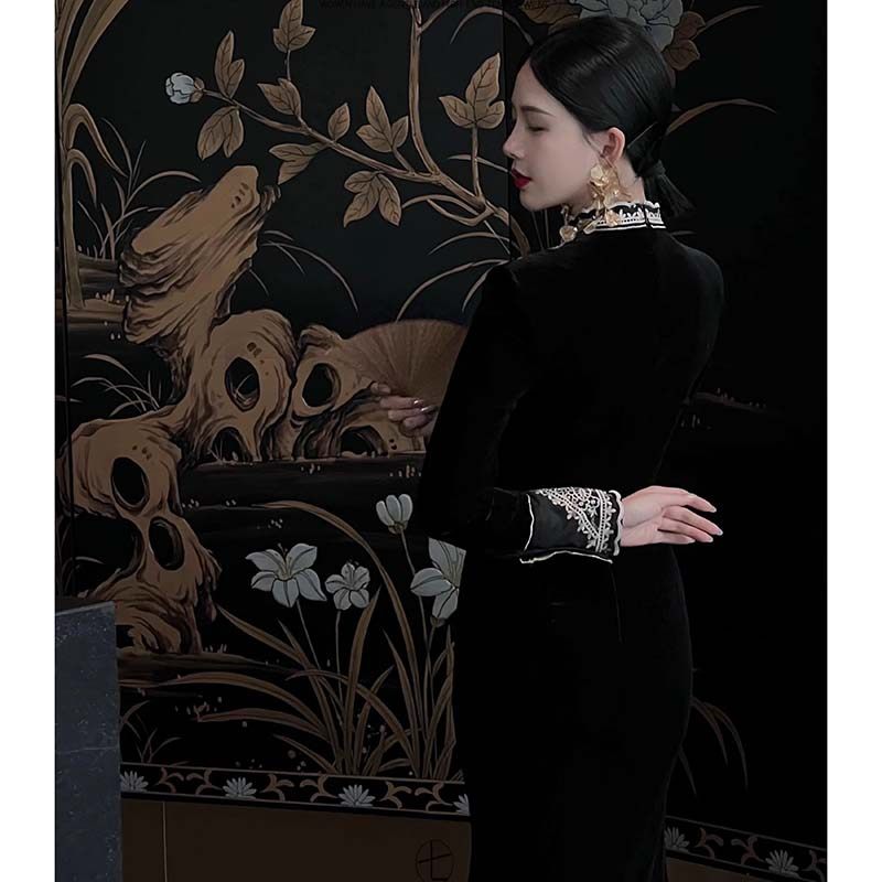 复古丝绒连衣裙2025秋冬新款新中式高级感国风旗袍裙D4005