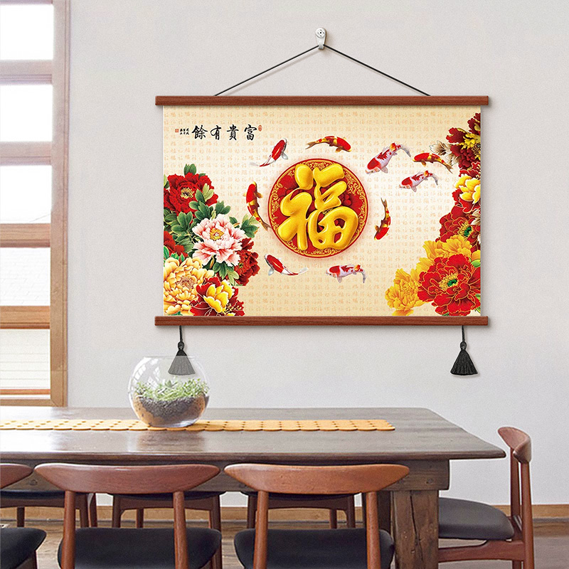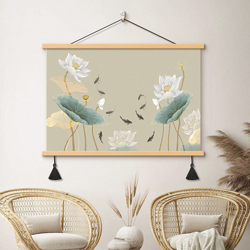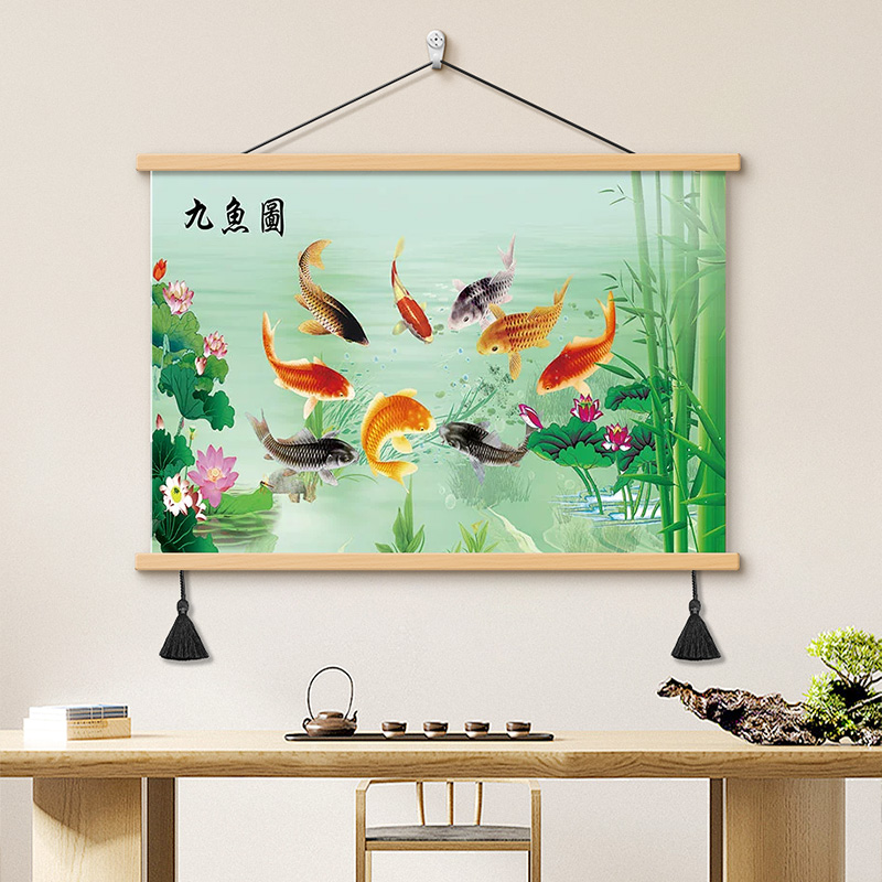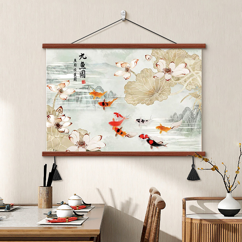 荷花九鱼图餐厅装饰画新中式卷轴挂布吃饭厅挂画书房茶室客厅壁画