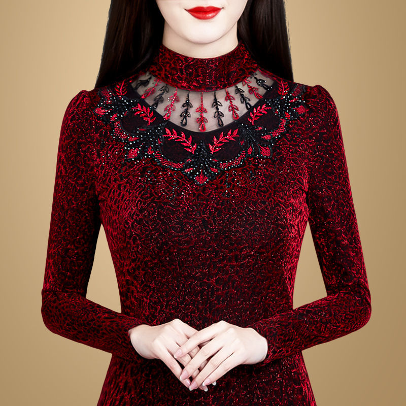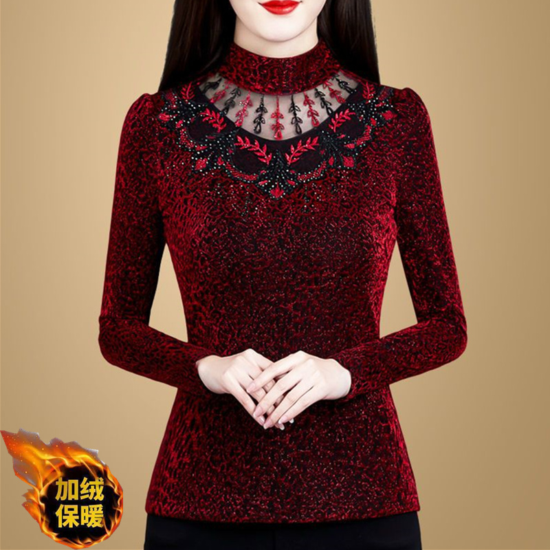 加绒加厚网纱蕾丝打底衫女秋冬季长袖上衣2022洋气半高领内搭小衫