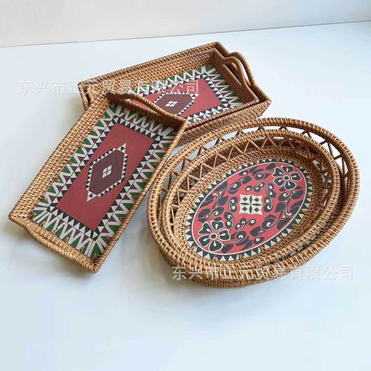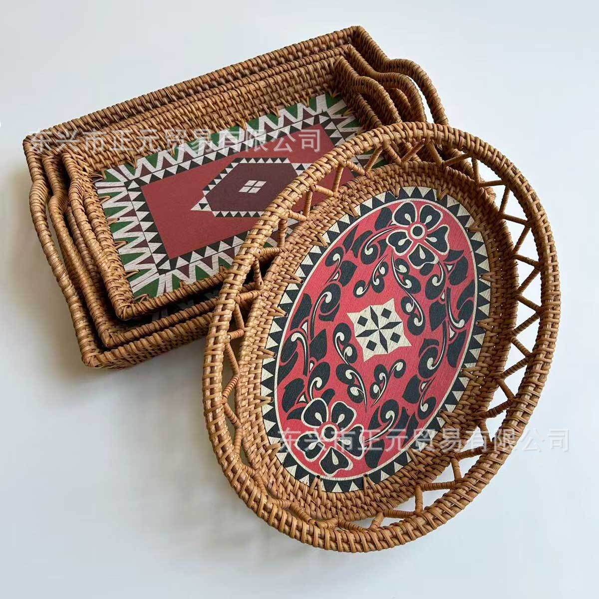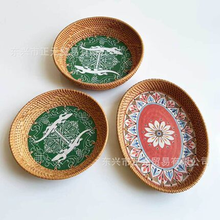 越南藤编果盘水果篮复古印花托盘桌面糖果零食面包收纳筐编织果篮