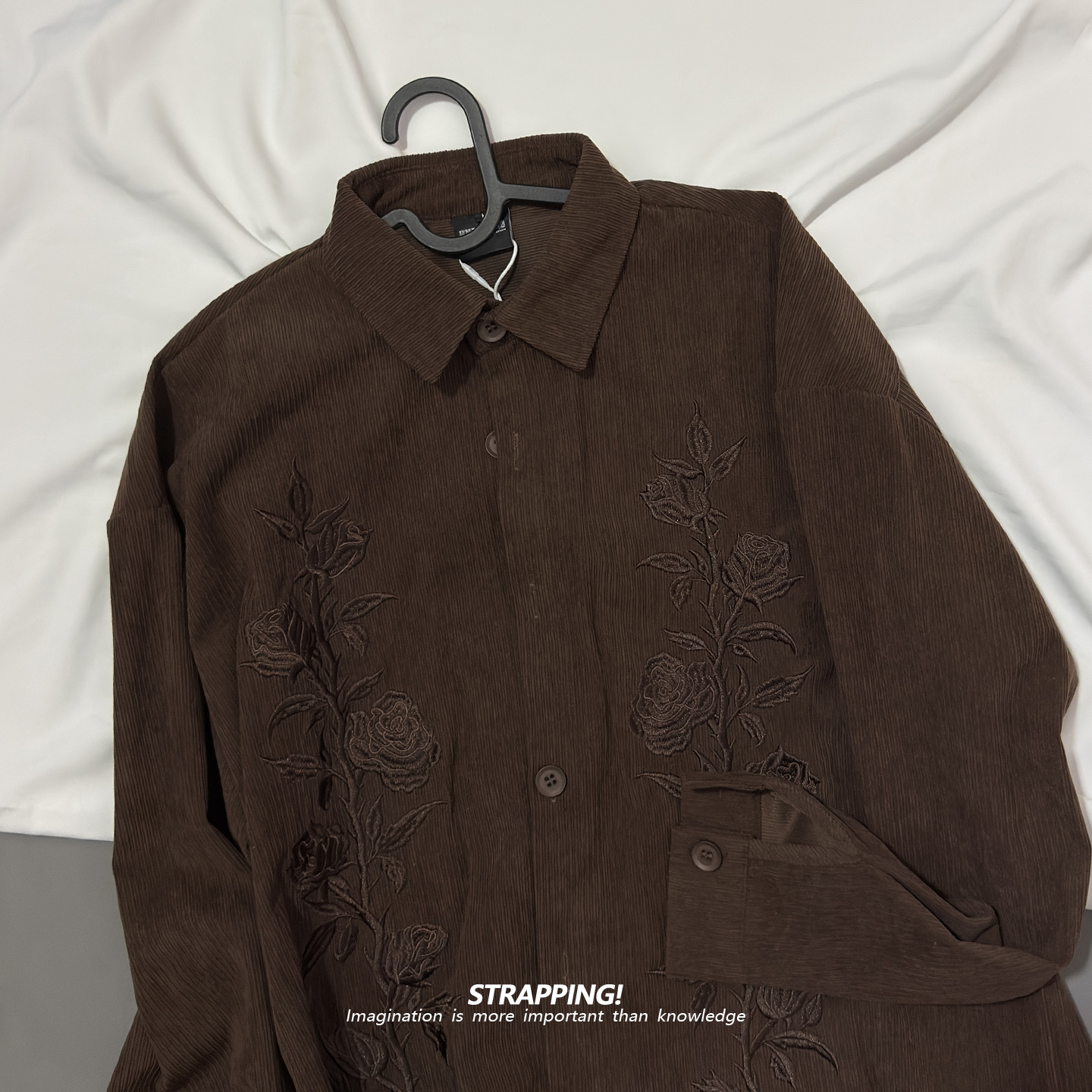 STRAPPING植物绣花灯芯绒涤纶长袖衬衫男女日系复古港风潮流街头