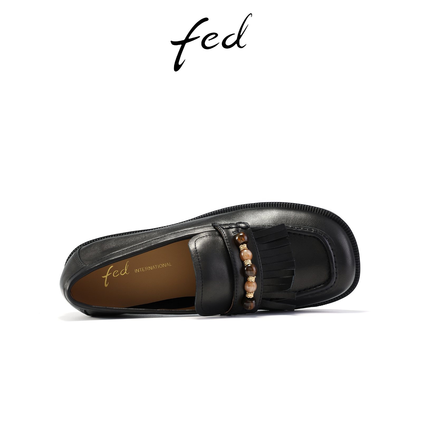 fed串珠乐福鞋秋季新款女鞋一脚蹬单鞋黑色真皮鞋女款S0919-YA017