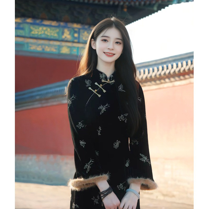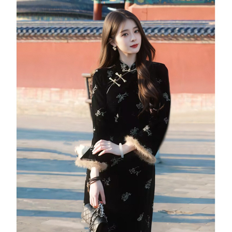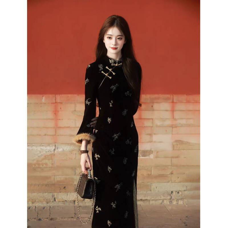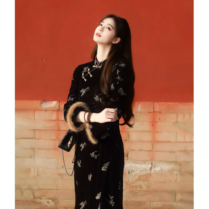 新中式国风丝绒改良旗袍高端大气上档次年轻款高级感气质连衣裙秋