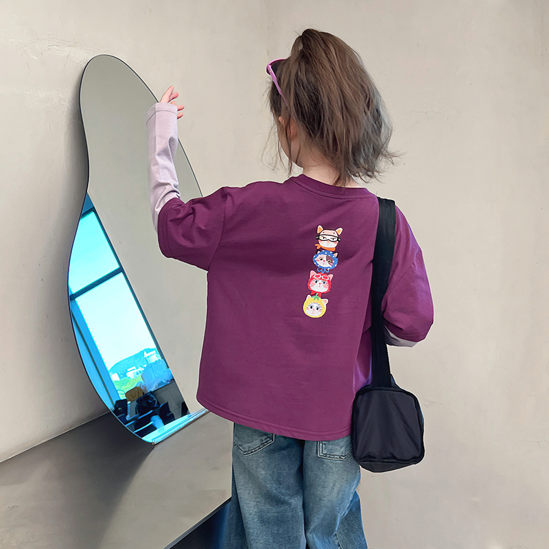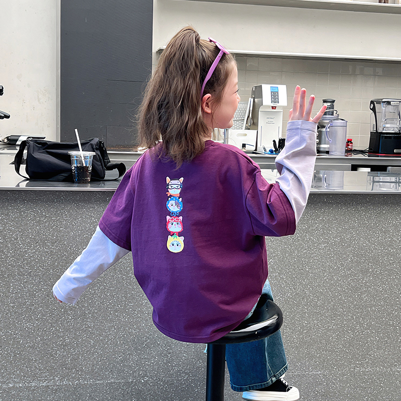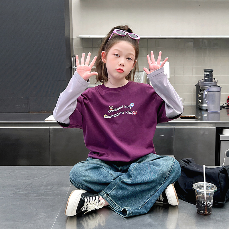 儿童假两件t恤女童洋气长袖打底衫中大童内搭上衣2025春秋装新款