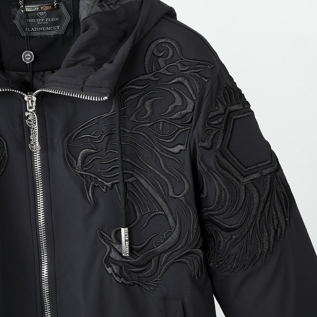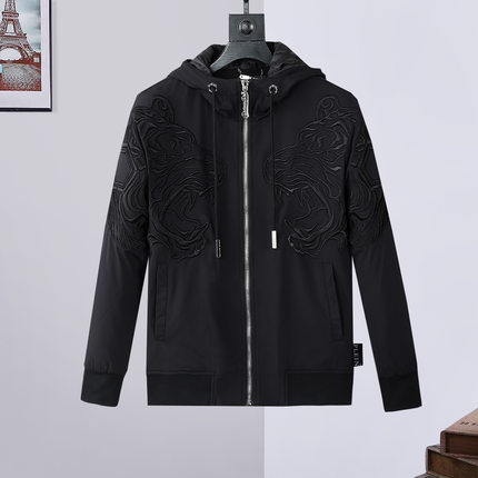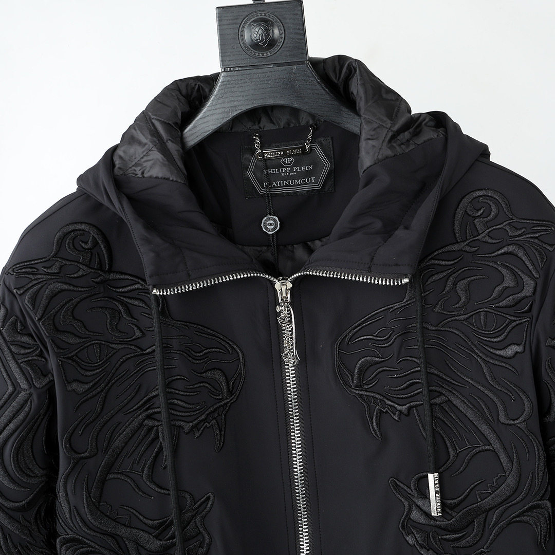 秋冬保暖双暗纹老虎头刺绣夹棉外套夹克拉链连帽休闲菲利普pp男装
