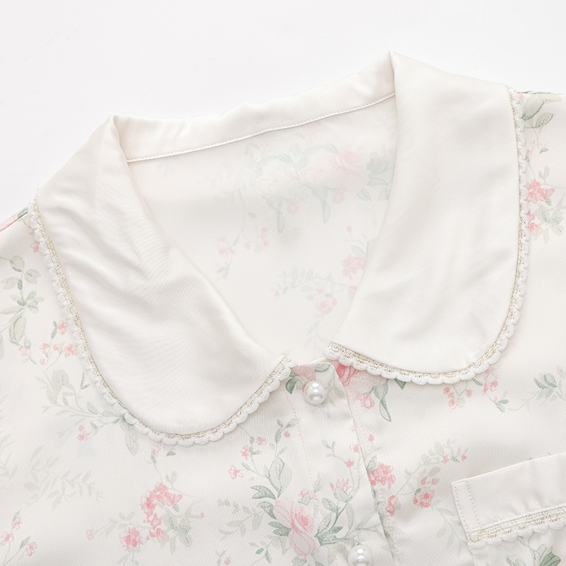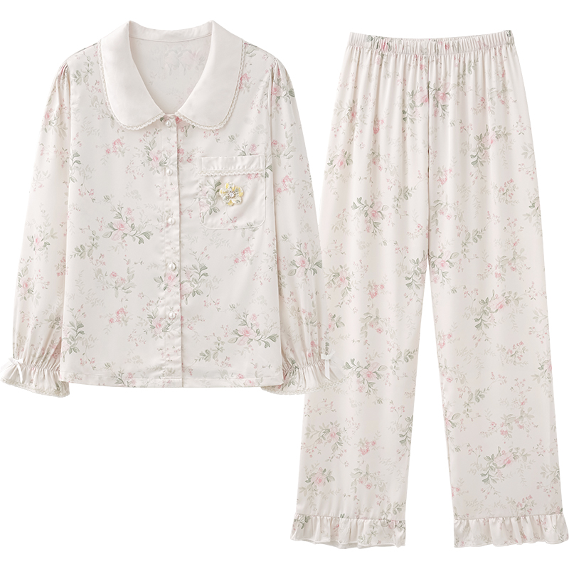 马克公主冰丝睡衣春秋女法式宫廷甜美碎花长袖丝绸套装凉感家居服