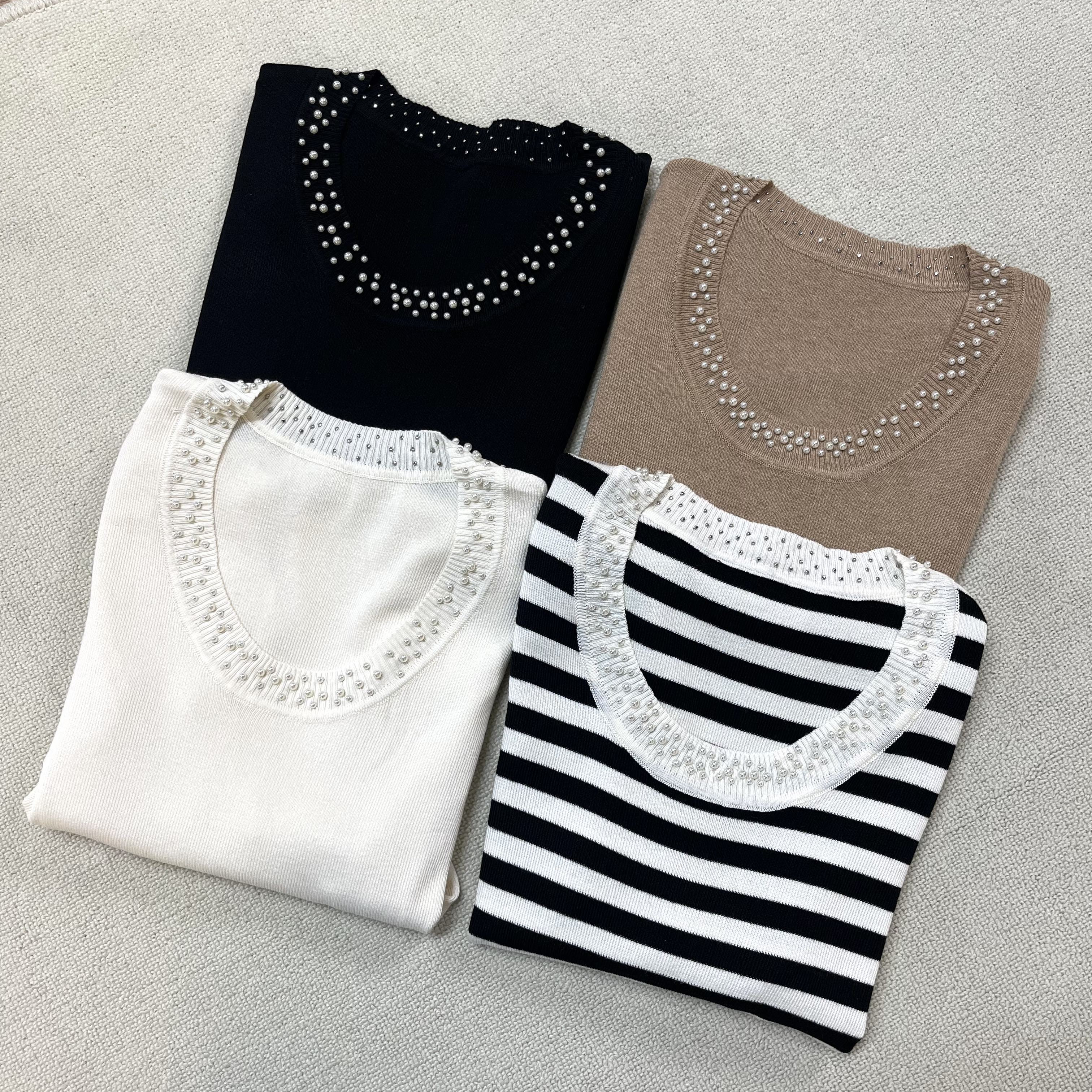 春夏新款重工钉珠圆领U领上衣莫代尔短袖冰丝针织衫女修身显瘦T恤