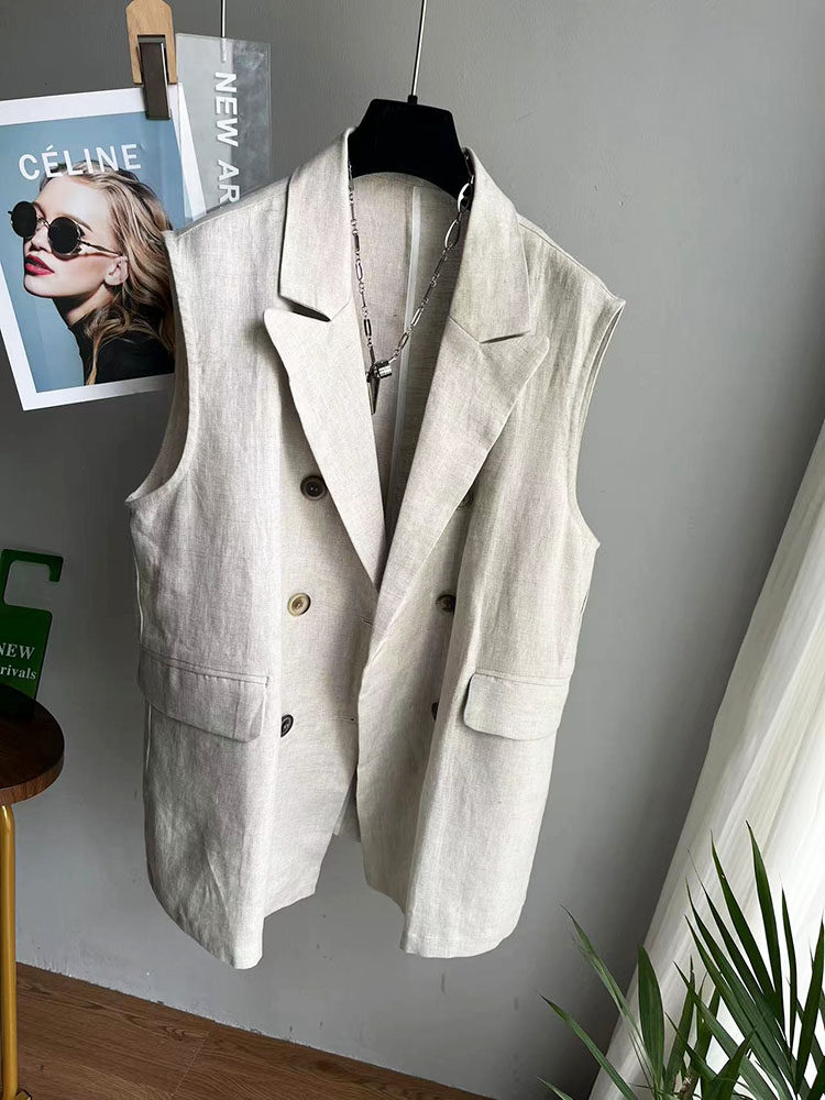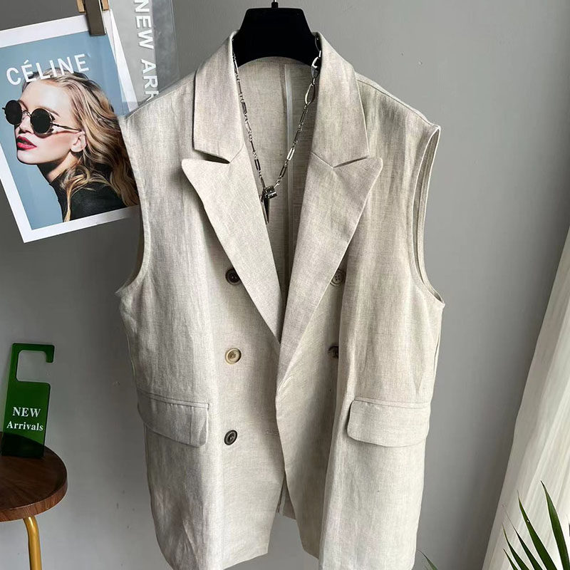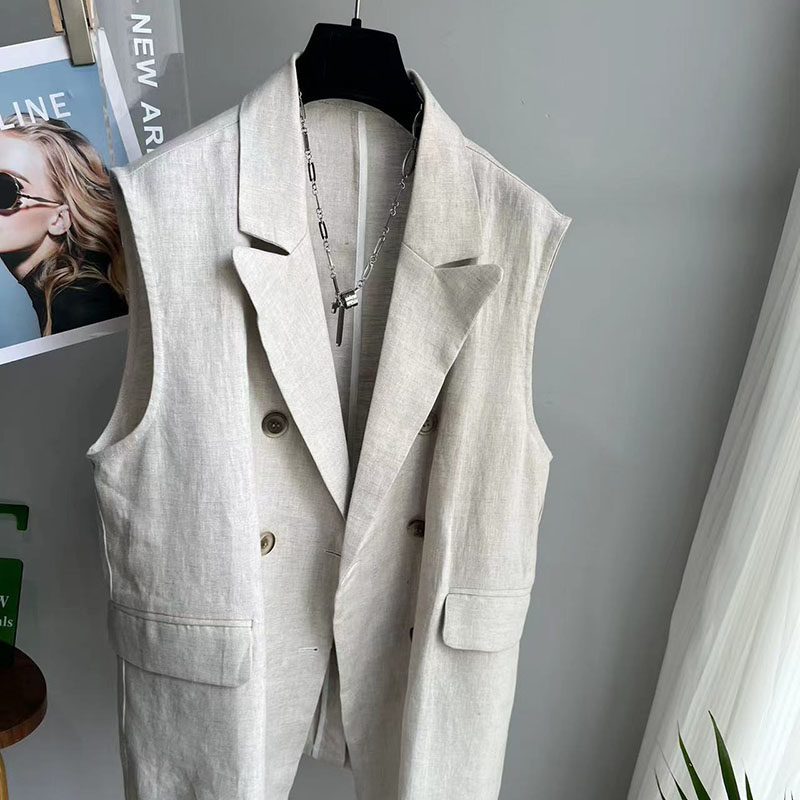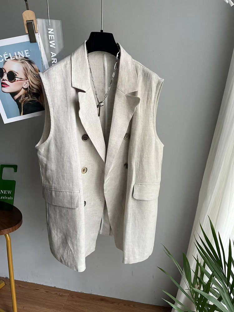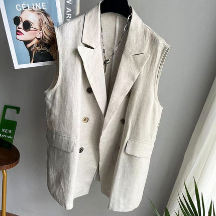 早春新款棉麻大码亚麻中长款西装马甲女后开衩双排扣无袖休闲外套