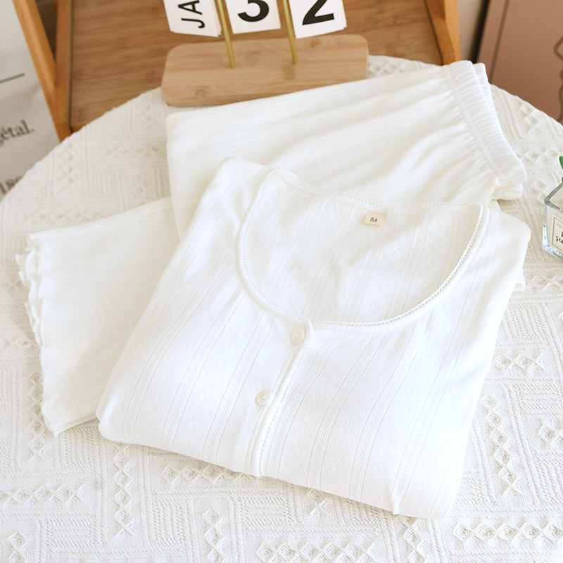 纯棉睡衣女士长袖长裤套装春夏秋冬季全棉家居服韩女简约带胸垫