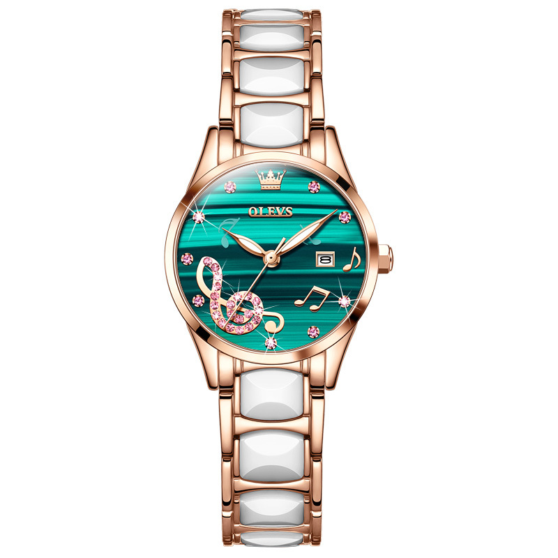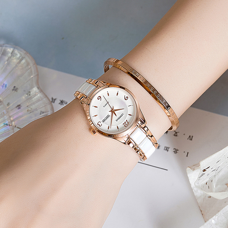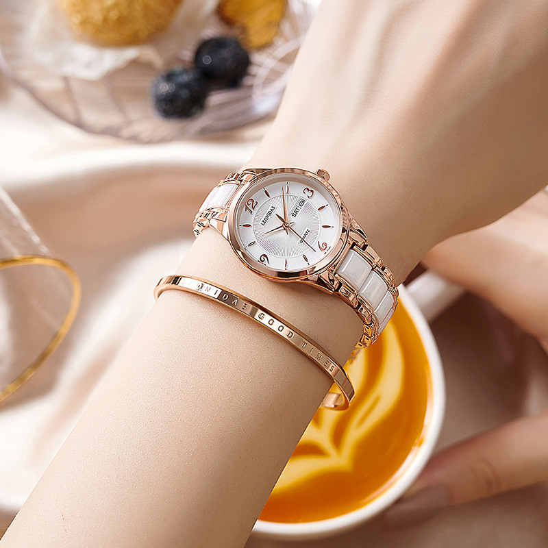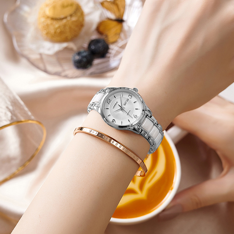 瑞士正品新款列奥尼达小表盘女表防水白色陶瓷钢带时尚潮流女士表
