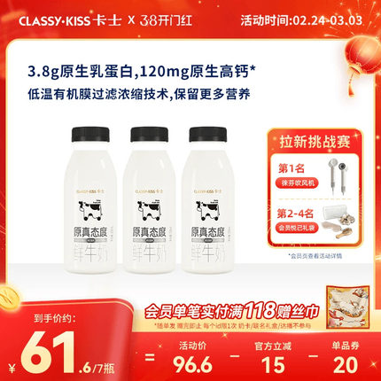 卡士原真态度鲜牛奶250ml全脂巴氏杀菌新鲜牛奶鲜牛乳原味低温奶