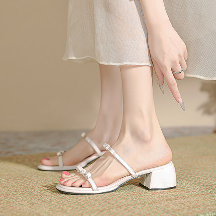仙女风绝美粗跟一字凉鞋女2025新款夏法式蝴蝶结拖鞋女外穿凉拖鞋