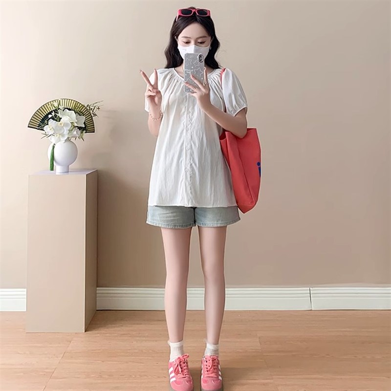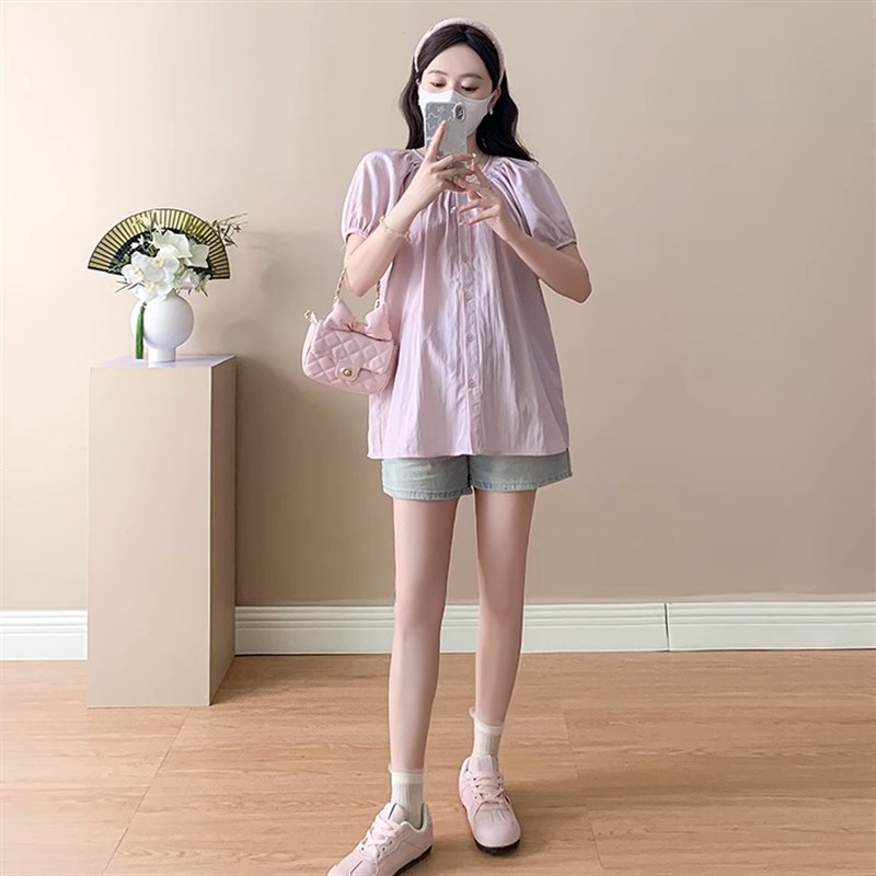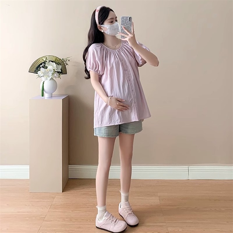 孕妇套装夏季2025新款粉色减龄雪纺衬衫可哺乳上衣牛仔短裤两件套