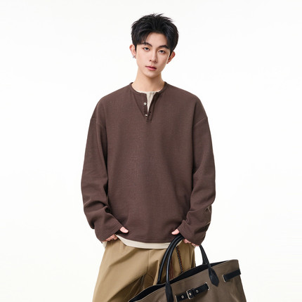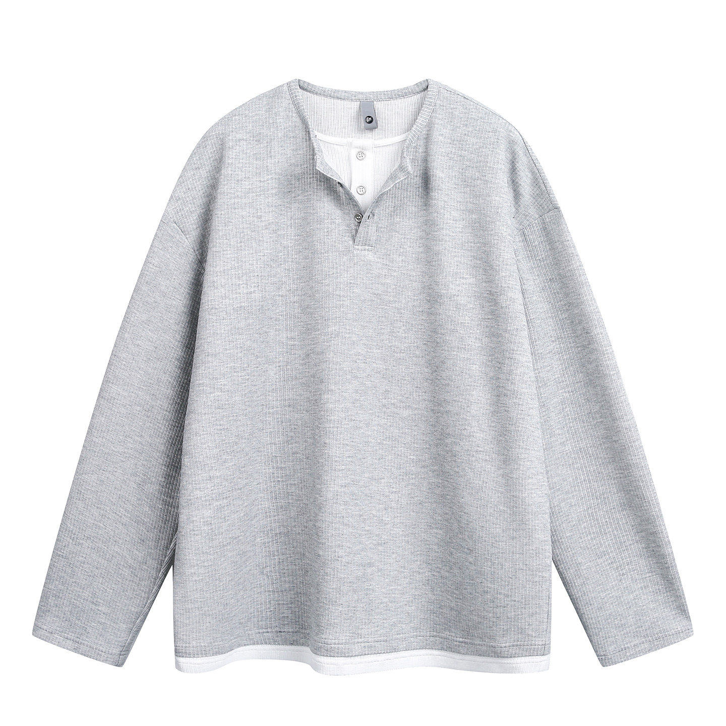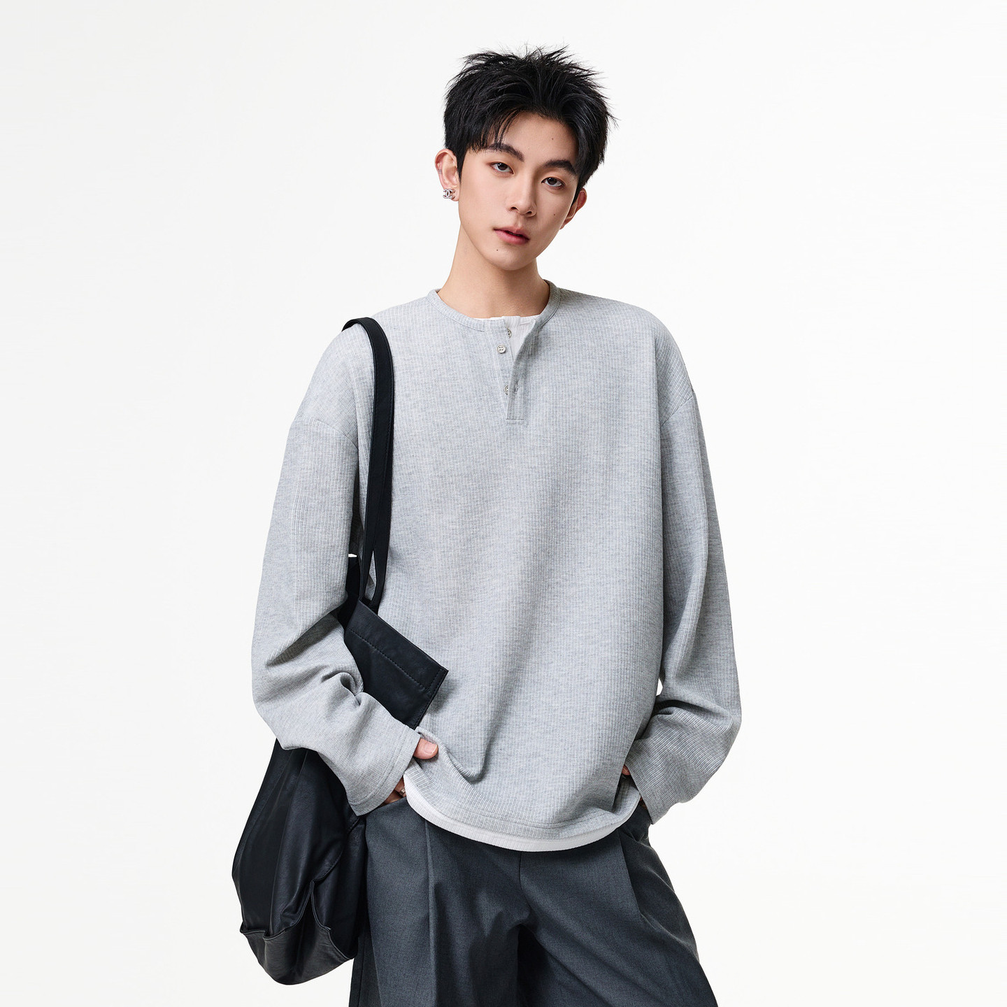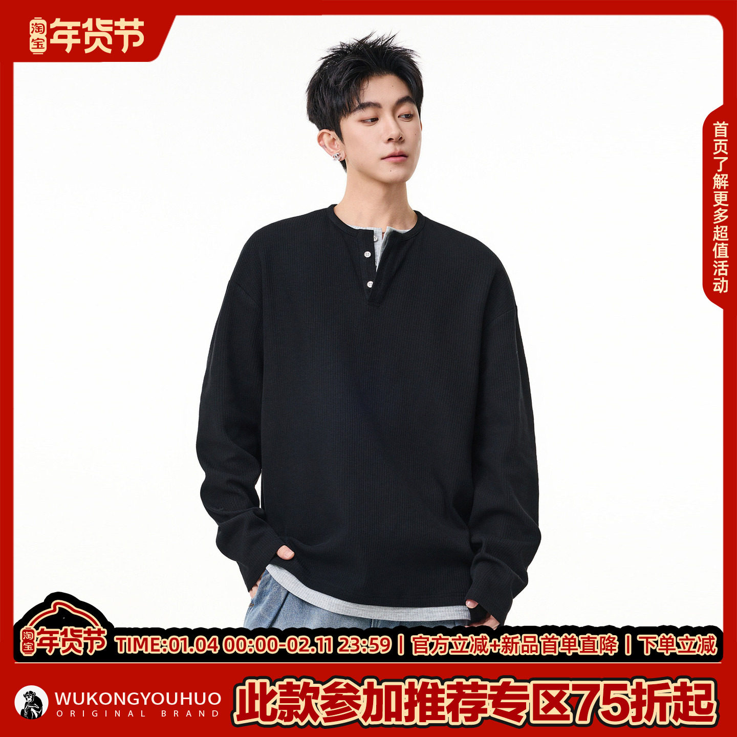 悟空有货春季复古假两件亨利领长袖T恤男女宽松情侣休闲百搭上衣