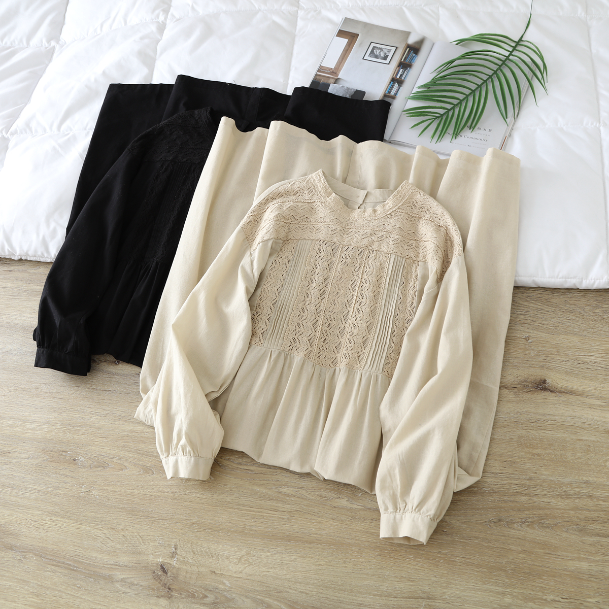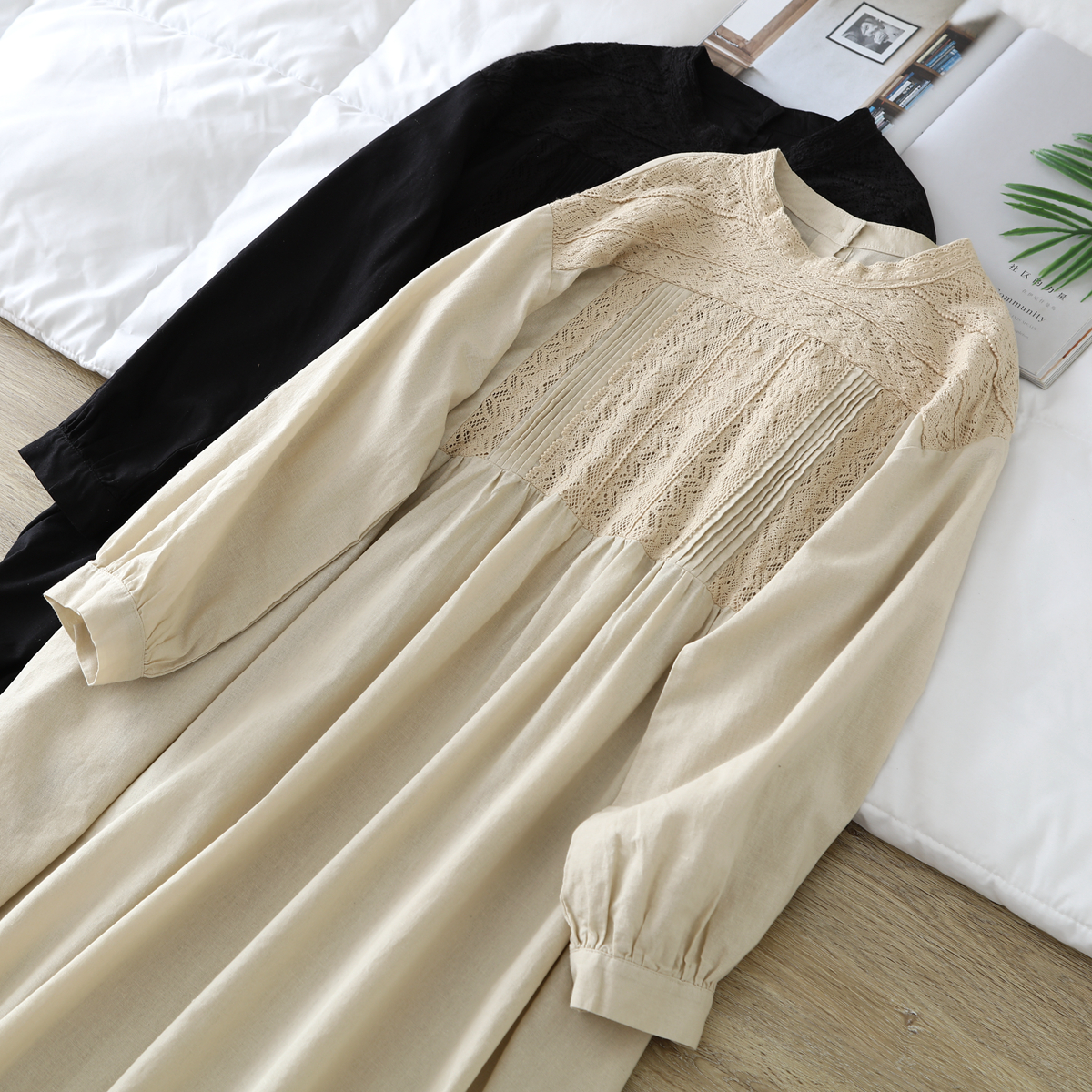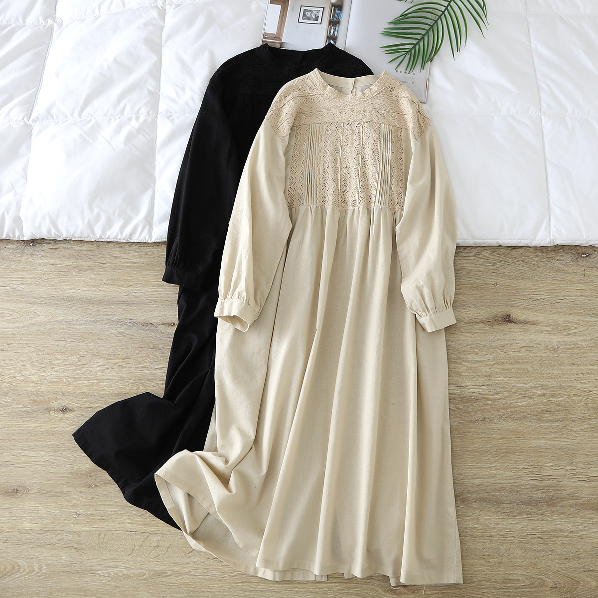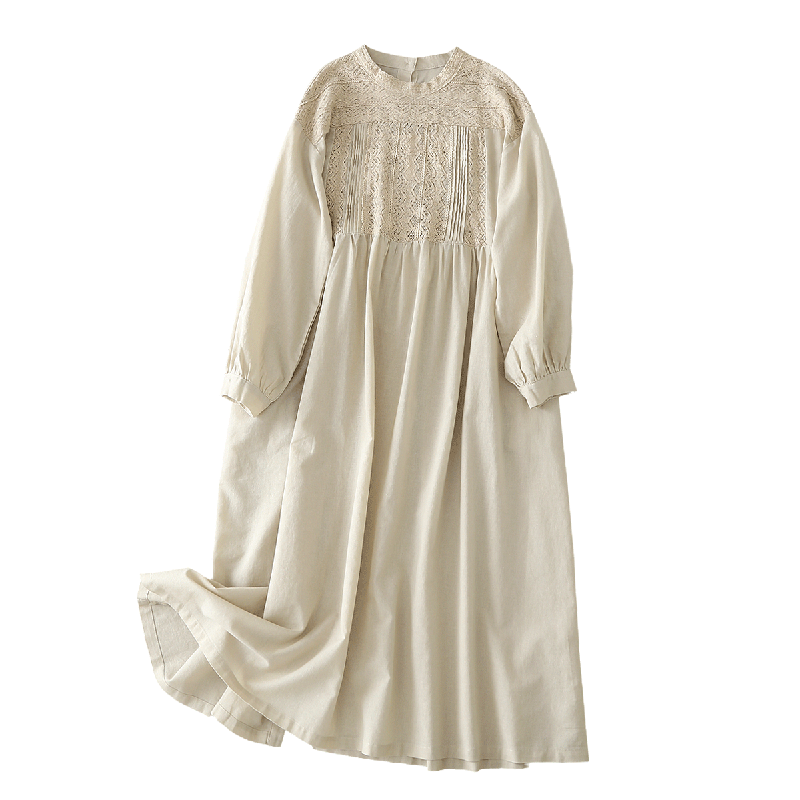 重工刺绣半高圆领甜美长袖连衣裙2024早秋新文艺复古宽松棉麻长裙