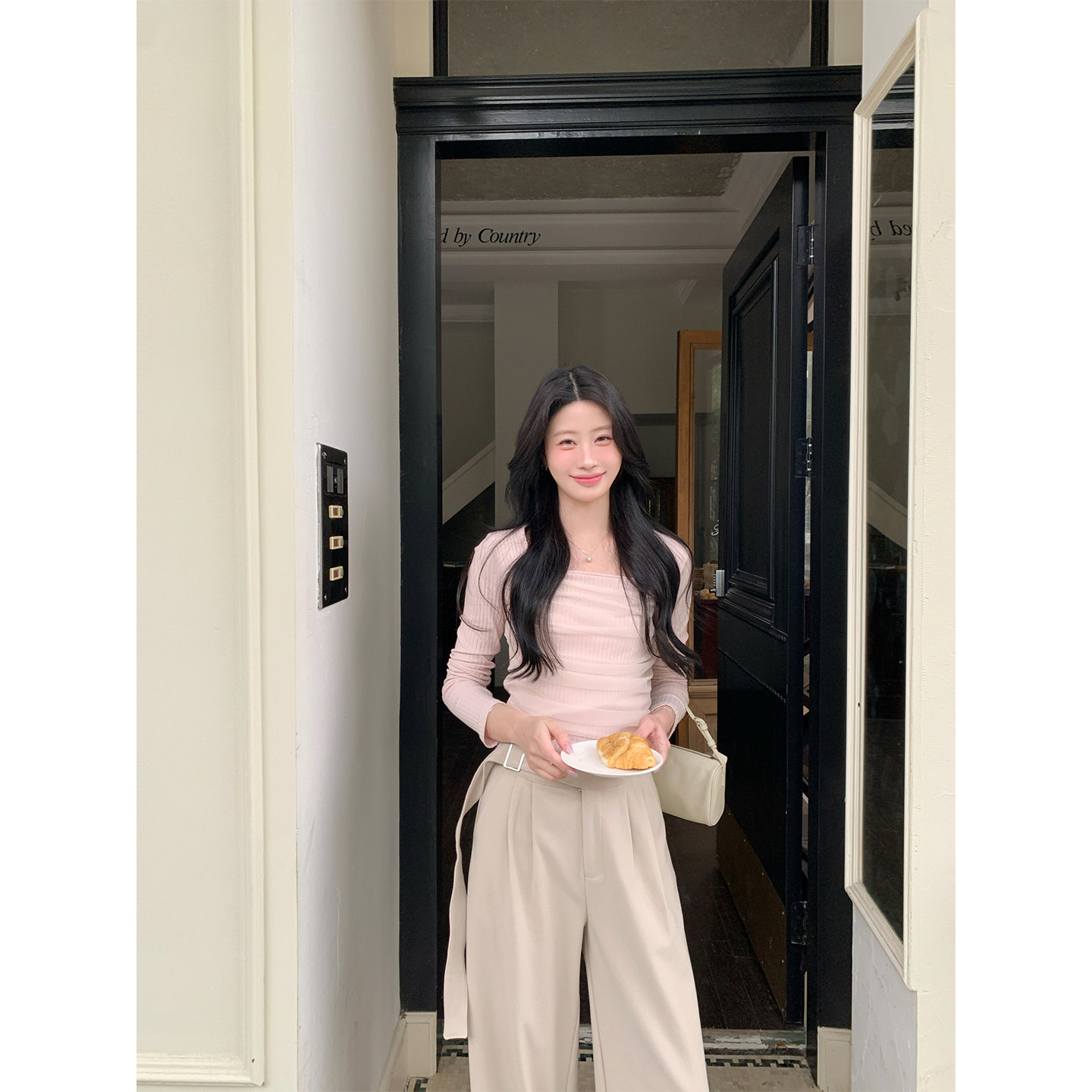 炸鸡欧尼JeJuna 芭乐少女 显气色春日粉雾纱拼接针织上衣长袖tee