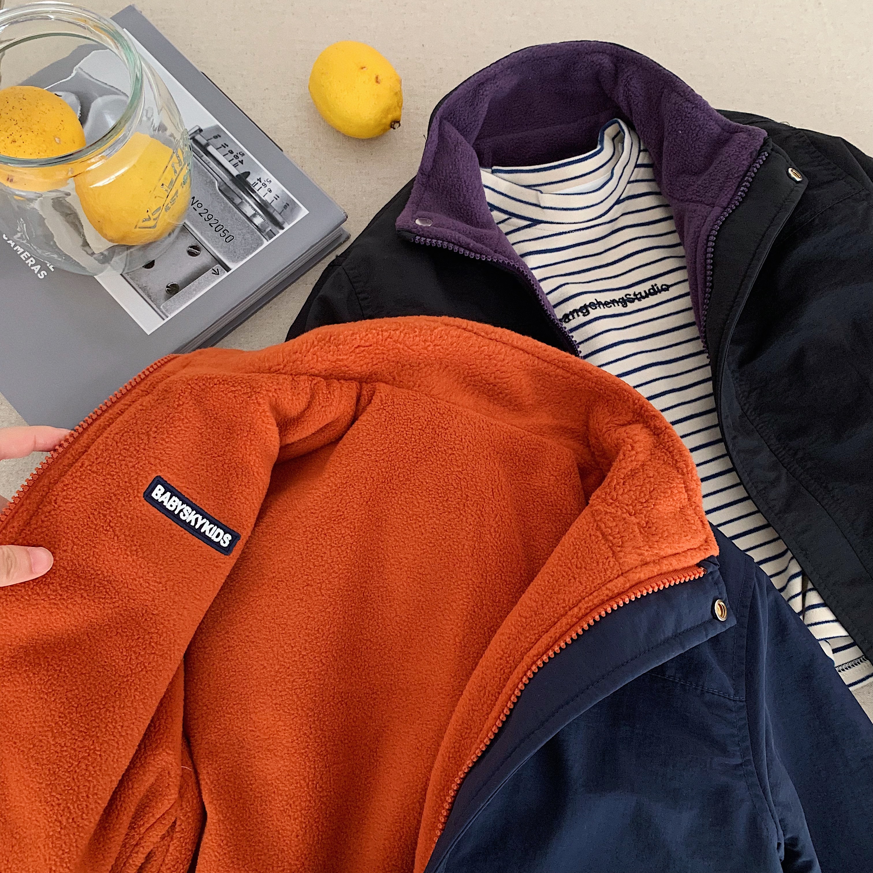 儿童双面穿外套男加绒冬季宝宝贴标毛毛衣保暖小童纯色夹克女洋气