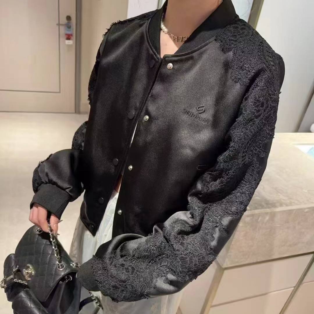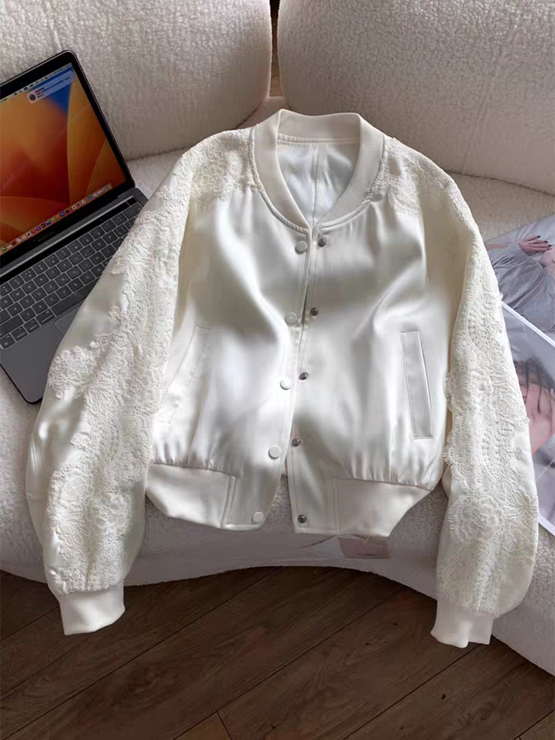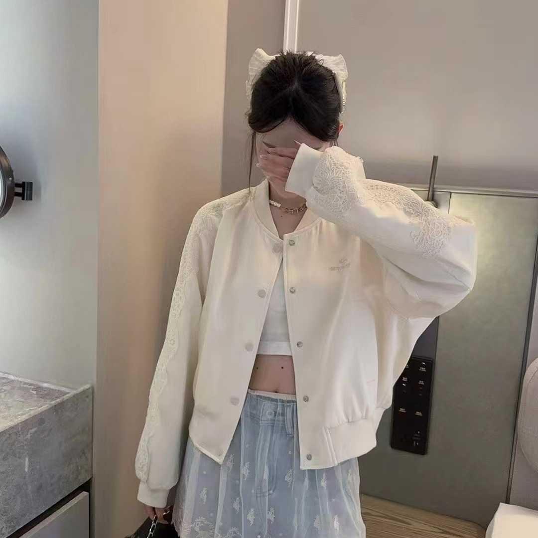 设计感蕾丝拼接棒球服短外套女欧洲站2025年春季新款时尚夹克上衣