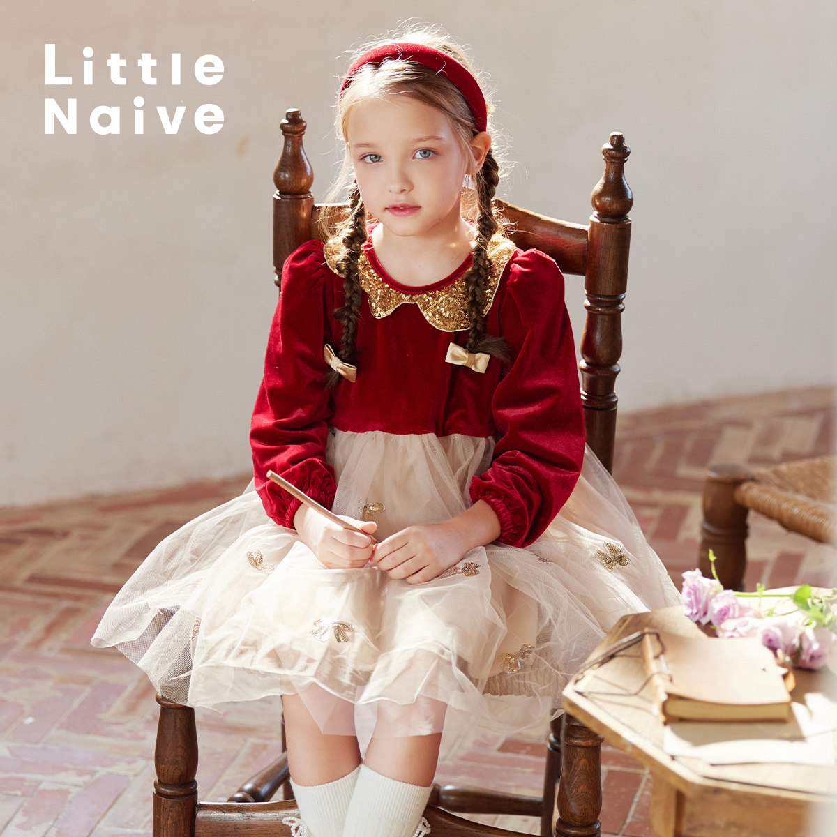 LittleNaive礼服女童秋冬节日亮片连衣裙儿童加绒蝴蝶结公主纱裙