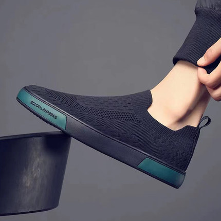 夏季大码男鞋透气休闲布鞋一脚蹬板鞋懒人鞋开车网面黑色袜子鞋男