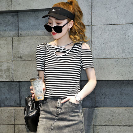 露肩条纹短袖T恤宽松上衣