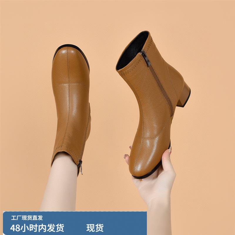 真皮粗跟短靴女2024年秋冬新款圆头低跟百搭中跟简约马丁靴女加绒