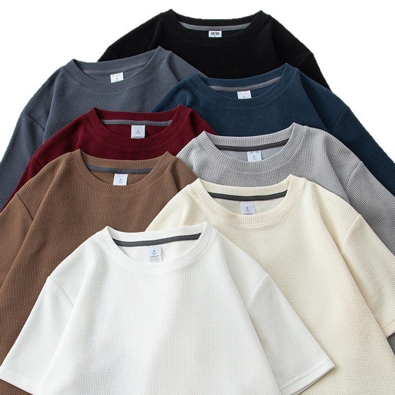 华夫格短袖t恤后包领男女夏季日系圆领半袖上衣宽松休闲纯色体恤