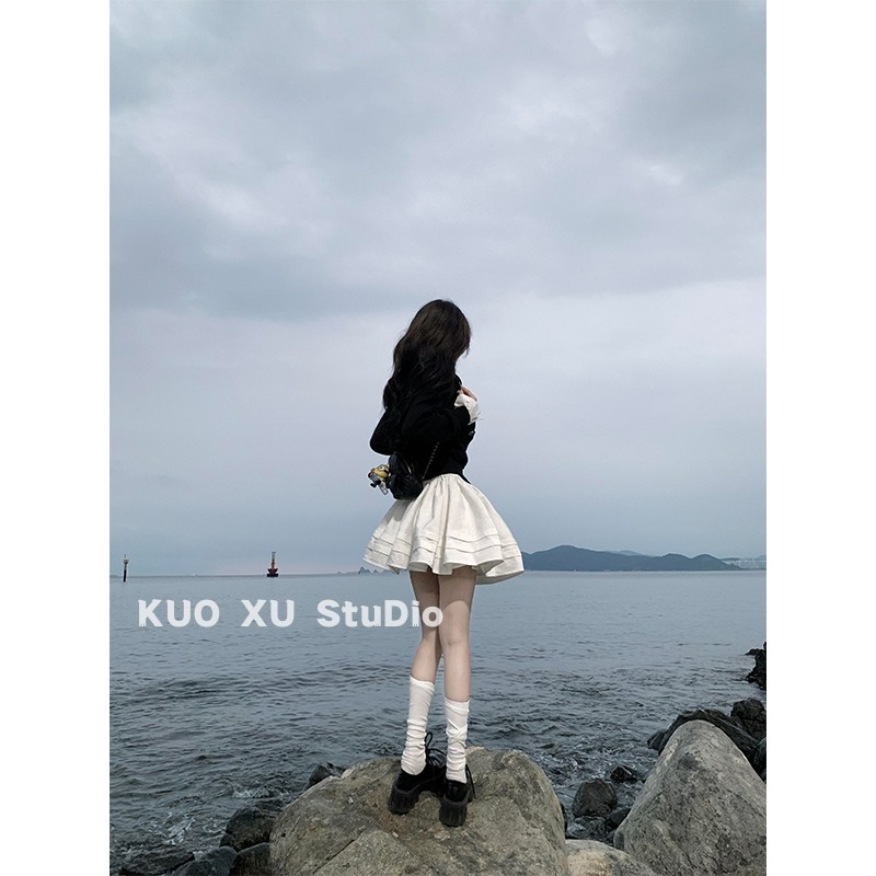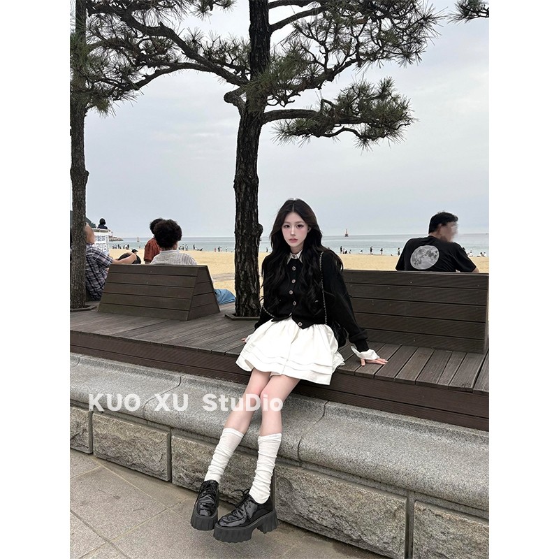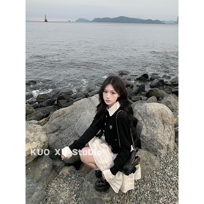 秋冬穿搭韩系学院风假两件针织开衫短款上衣高腰半身裙短裙套装女