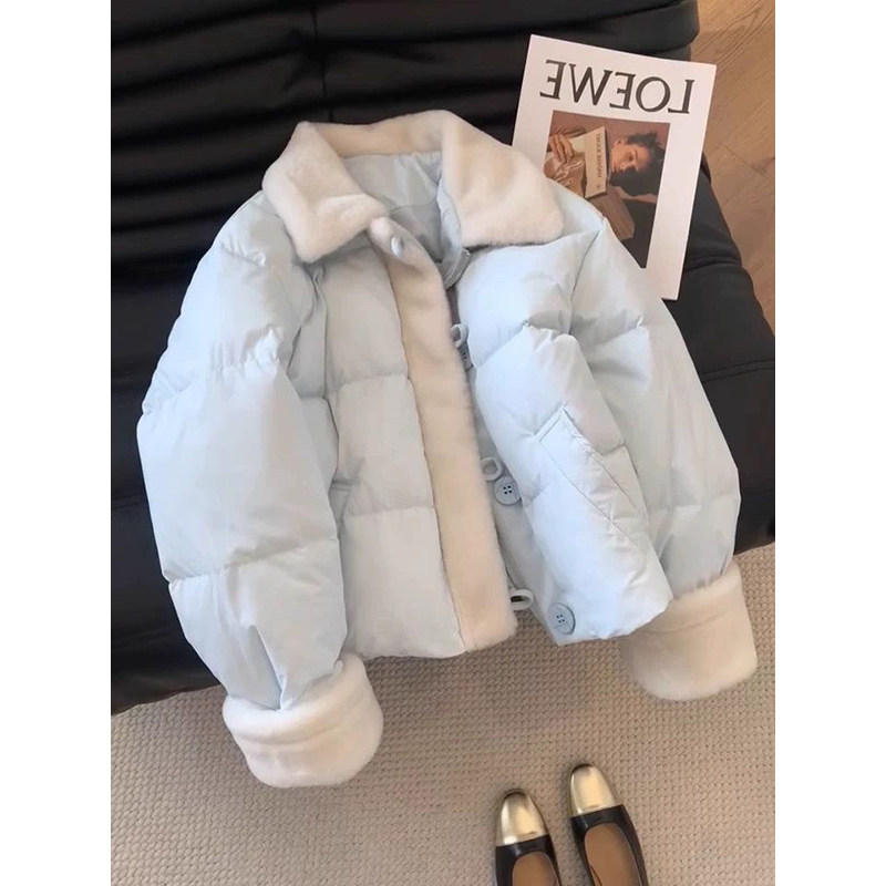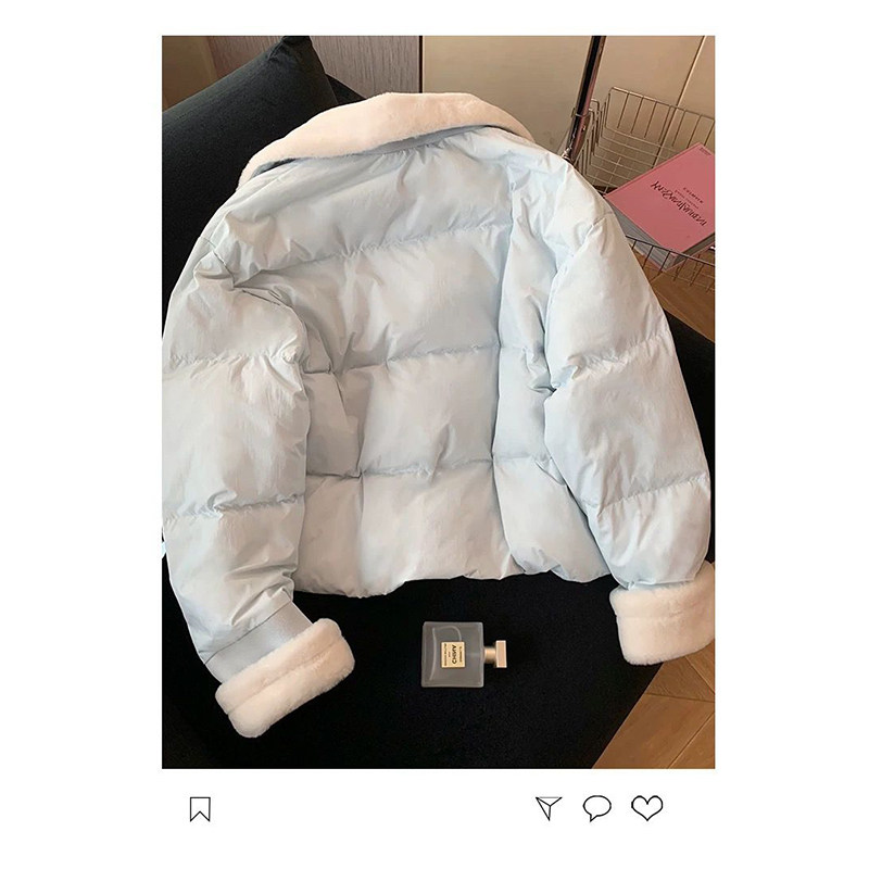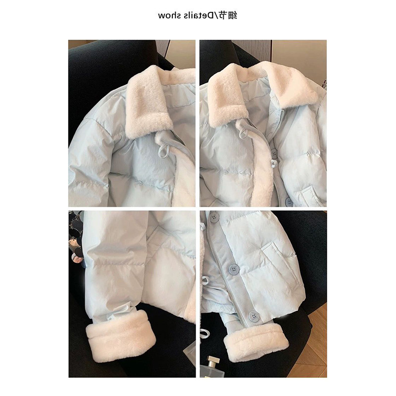 冬季新款慵懒风短款保暖宽松面包服女蓝色羊羔毛拼接翻领棉服外套
